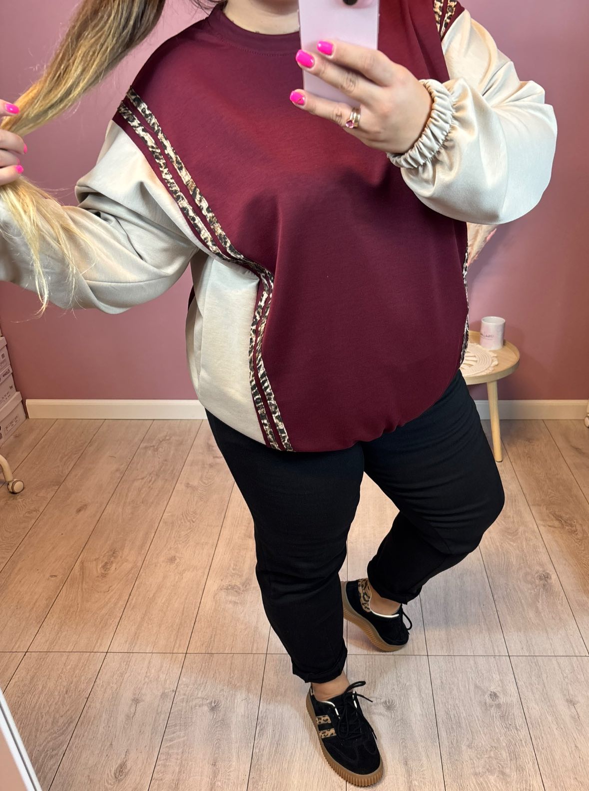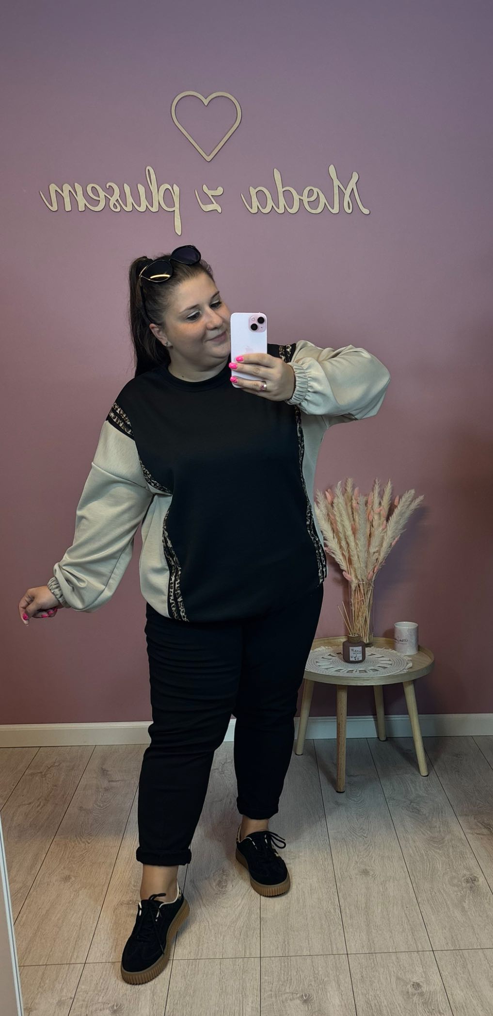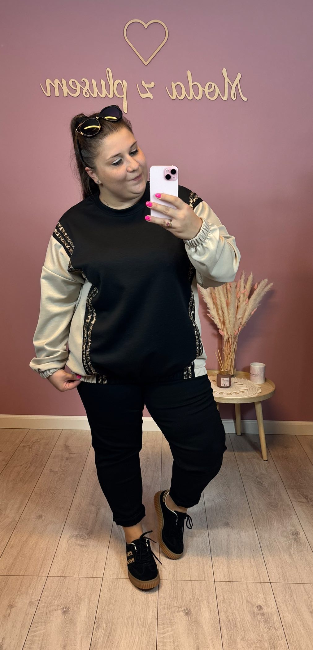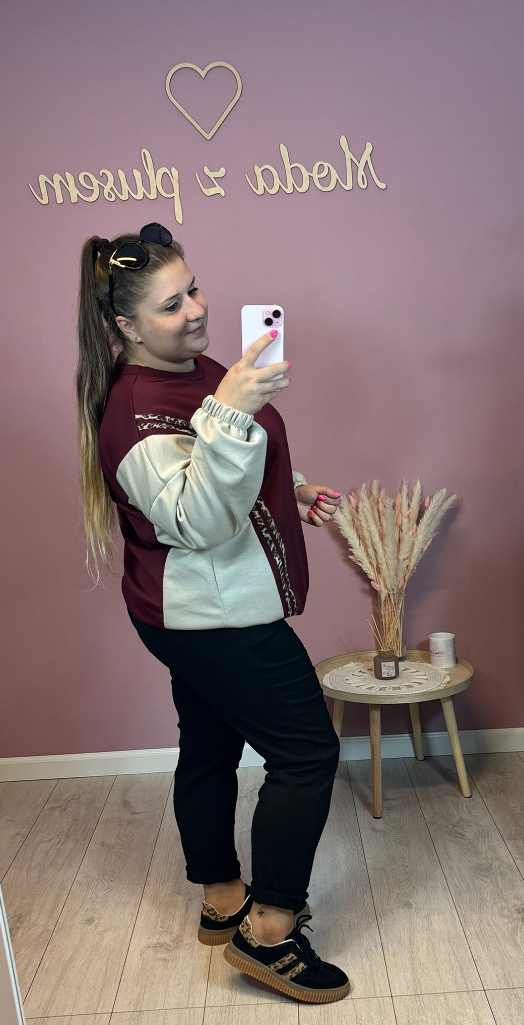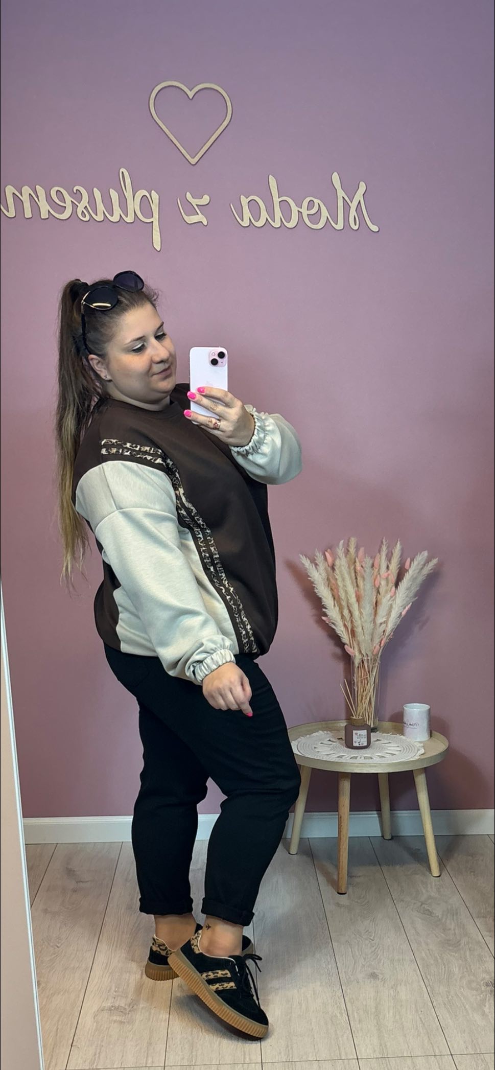 Bluza oversize w 3 modnych kolorach – dodatkowo posiada dodatek panterki i beżowych rękawów. Materiał mięciutkie „masełko”. Na dole ściągacz.