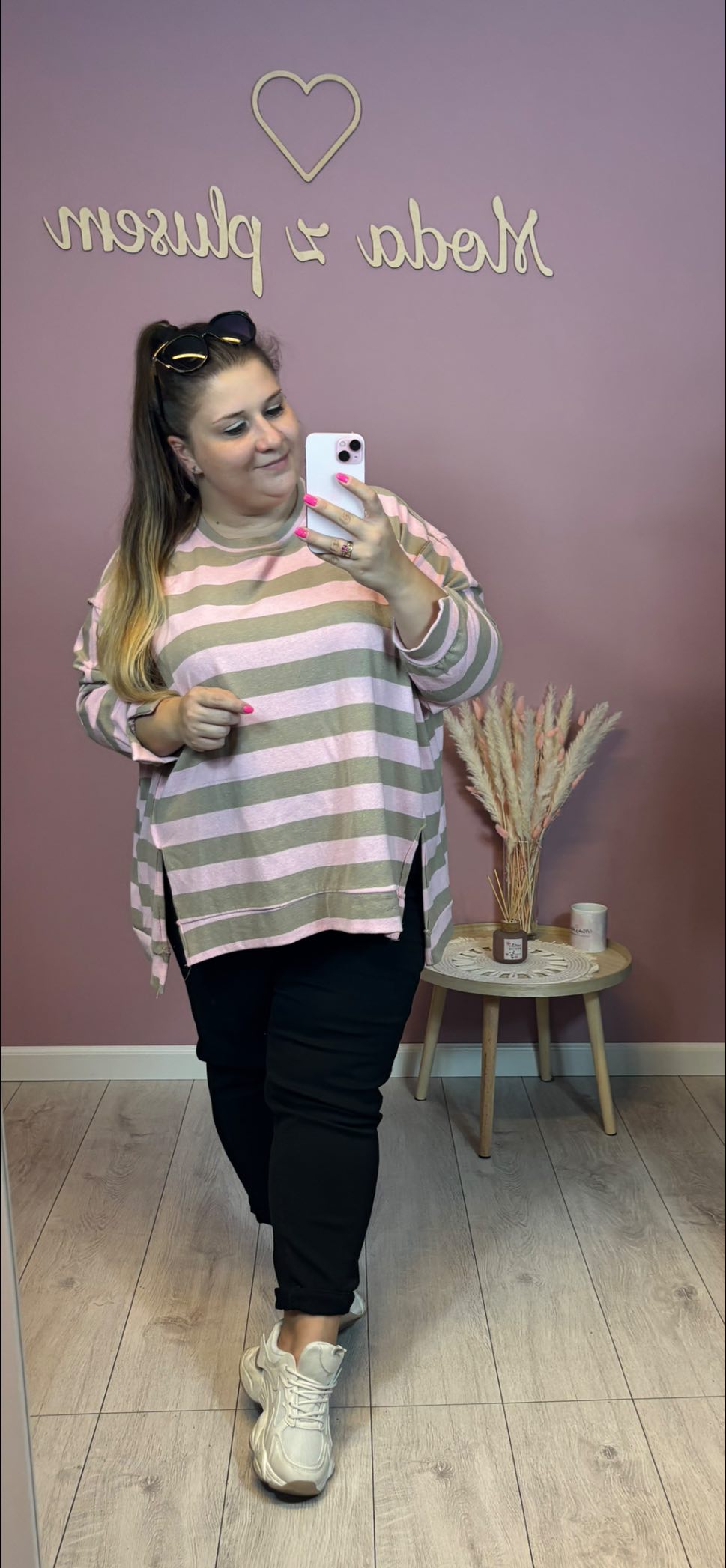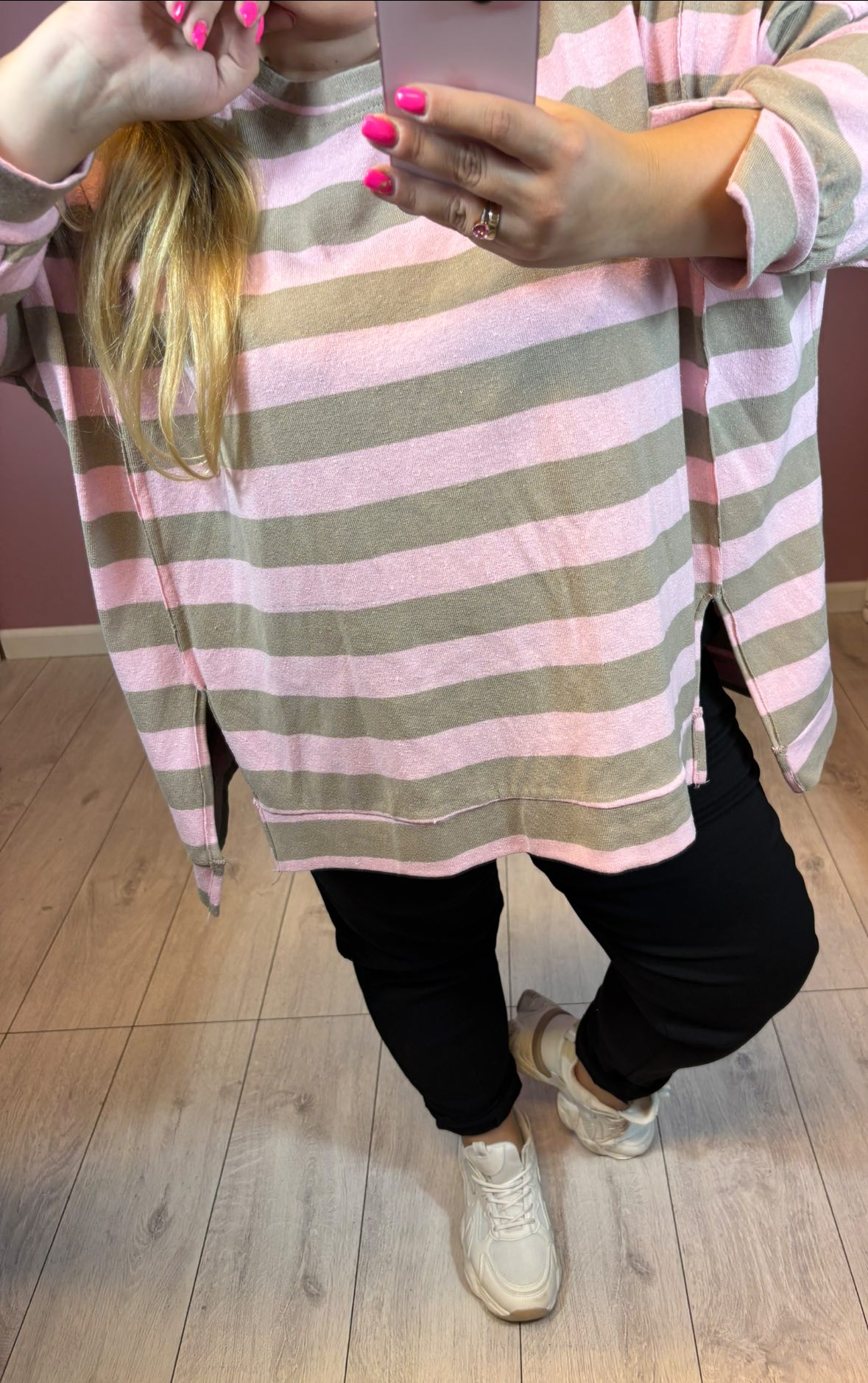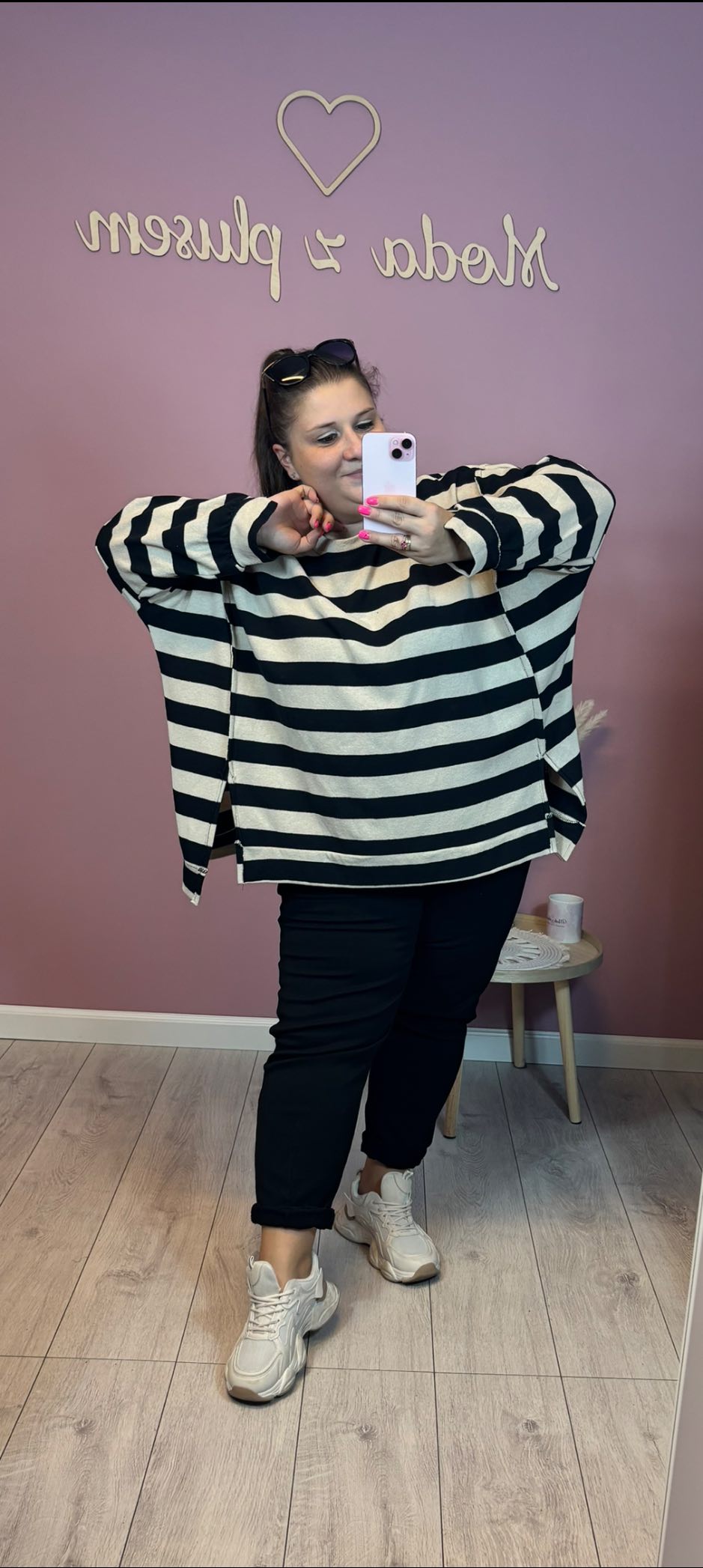 Mocno oversizowa hitowa bluza w paski – miła w dotyku jak sweter. Bluza ma przecięty ściągacz przy rękawie, przecięcia z przodu i jest szyta na surowo.