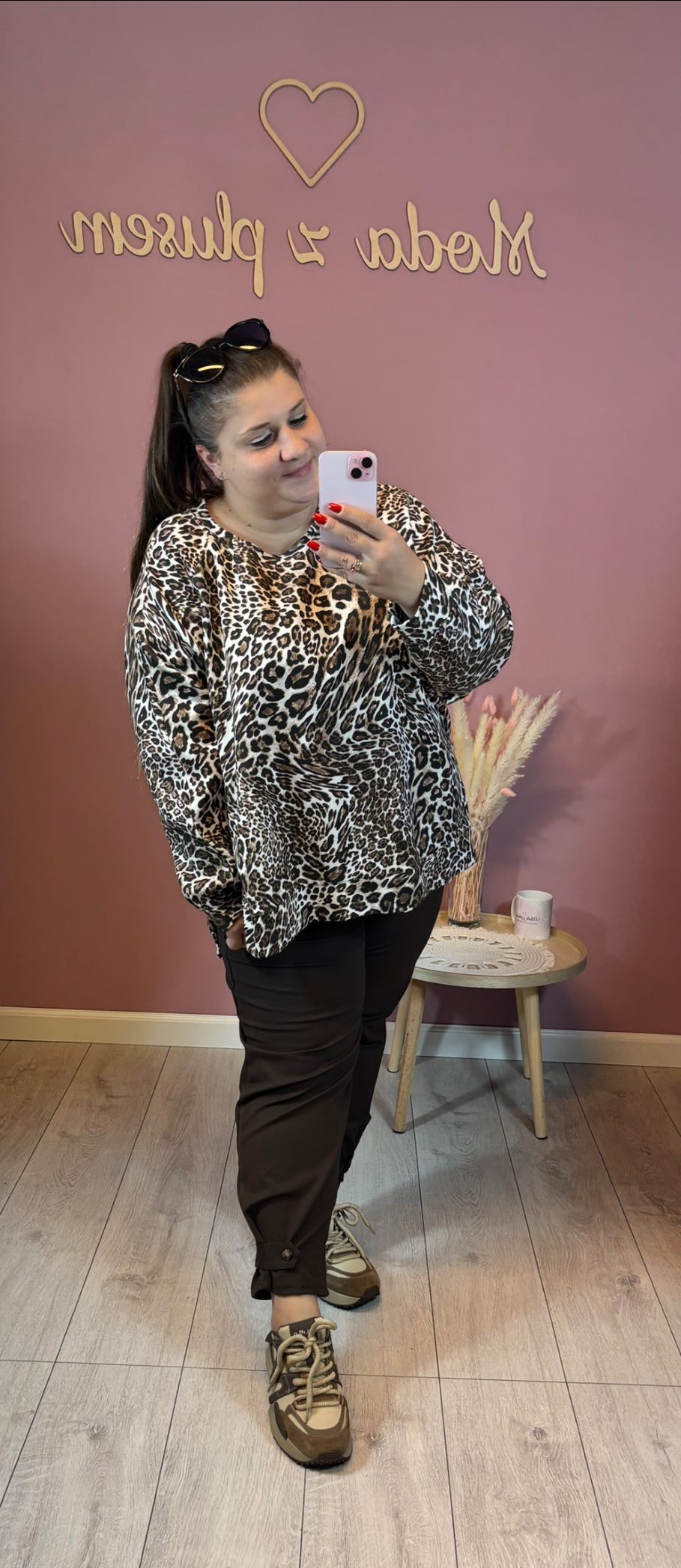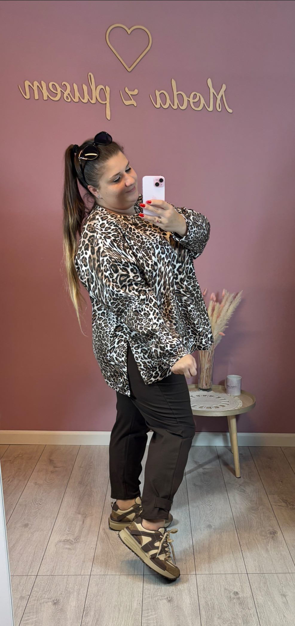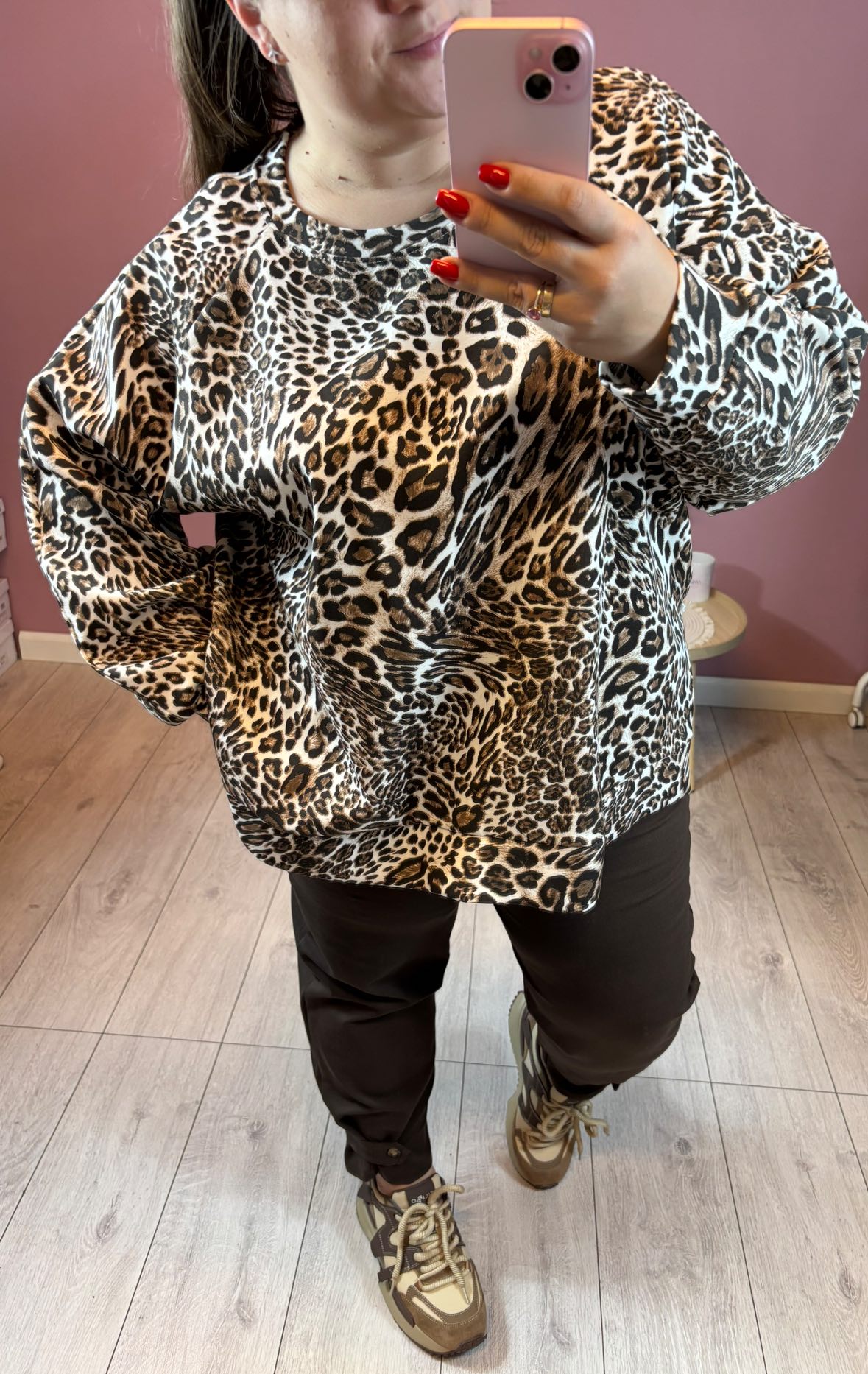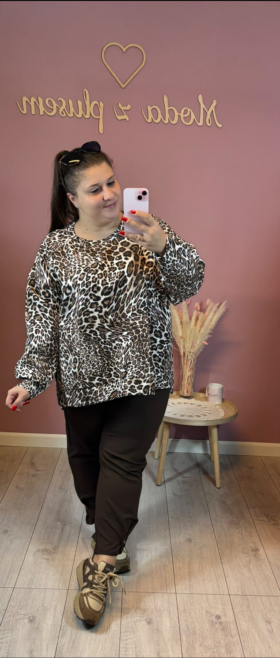Bluza jest z przodu delikatnie krótsza, z tyłu dłuższa. Model oversize.