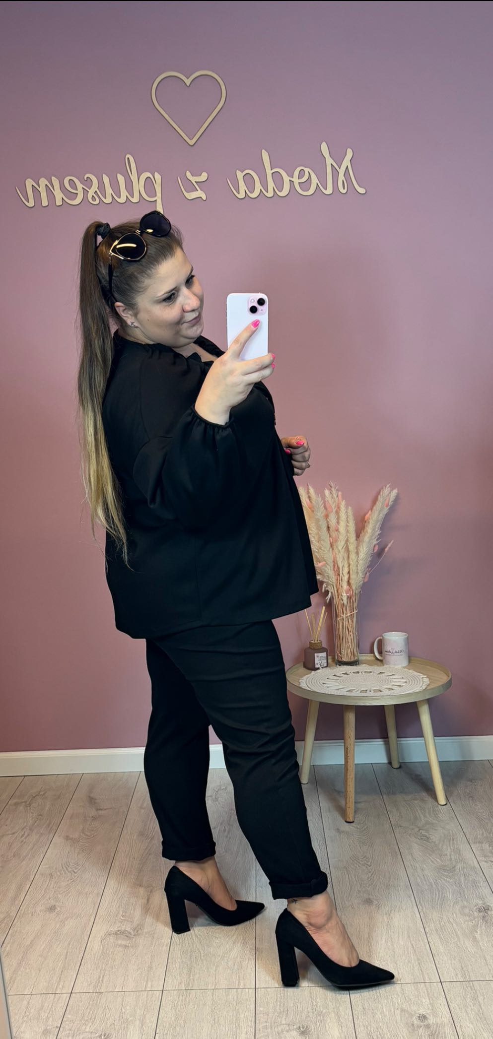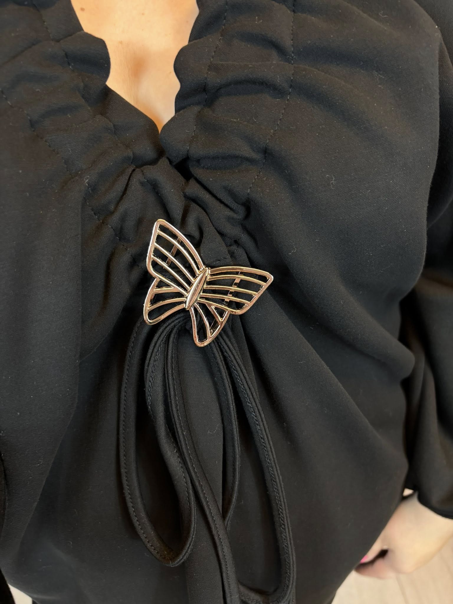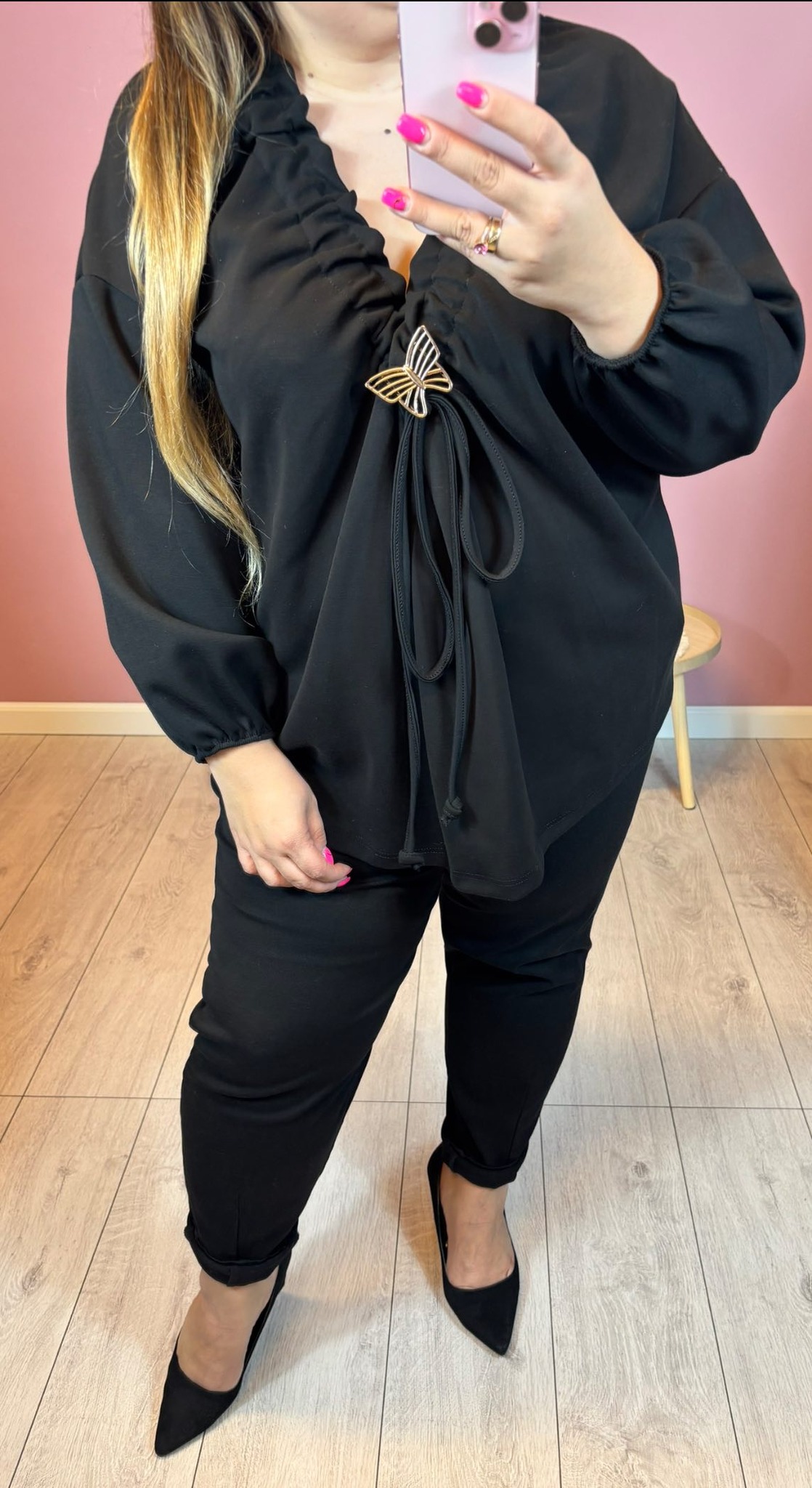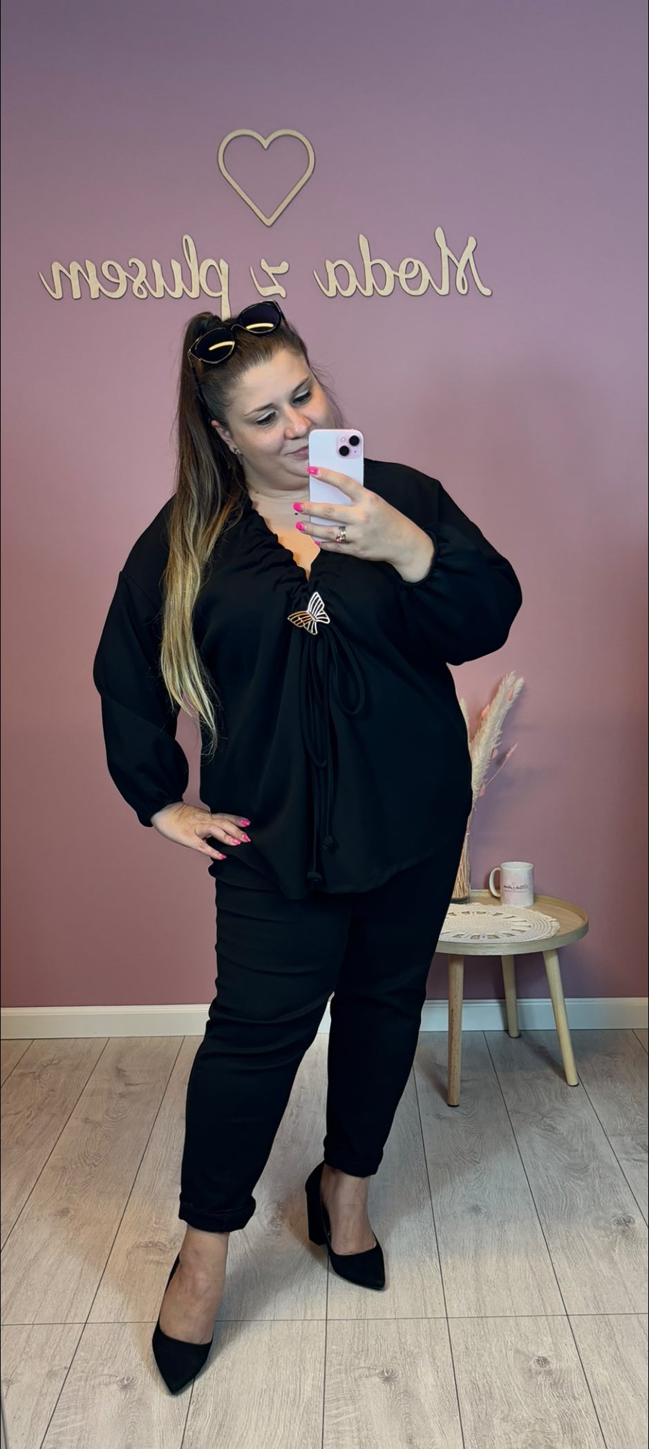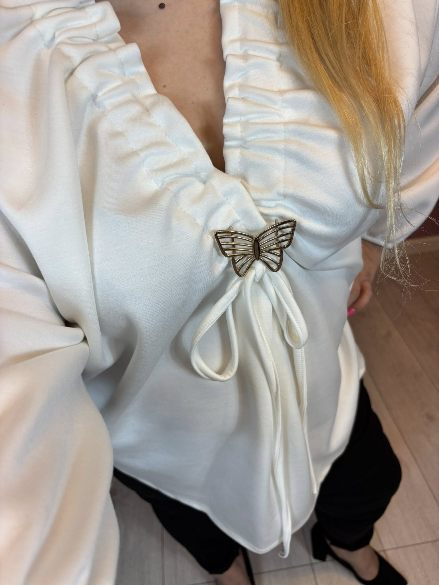 Bluzka z motylkowym dodatkiem na dekolcie. Nieco grubsza, z 95% wiskozy w składzie. Miła w dotyku, przepiękna. Dzięki marszczeniom wygląda fajnie też na mniejszym biuście. Model oversize.