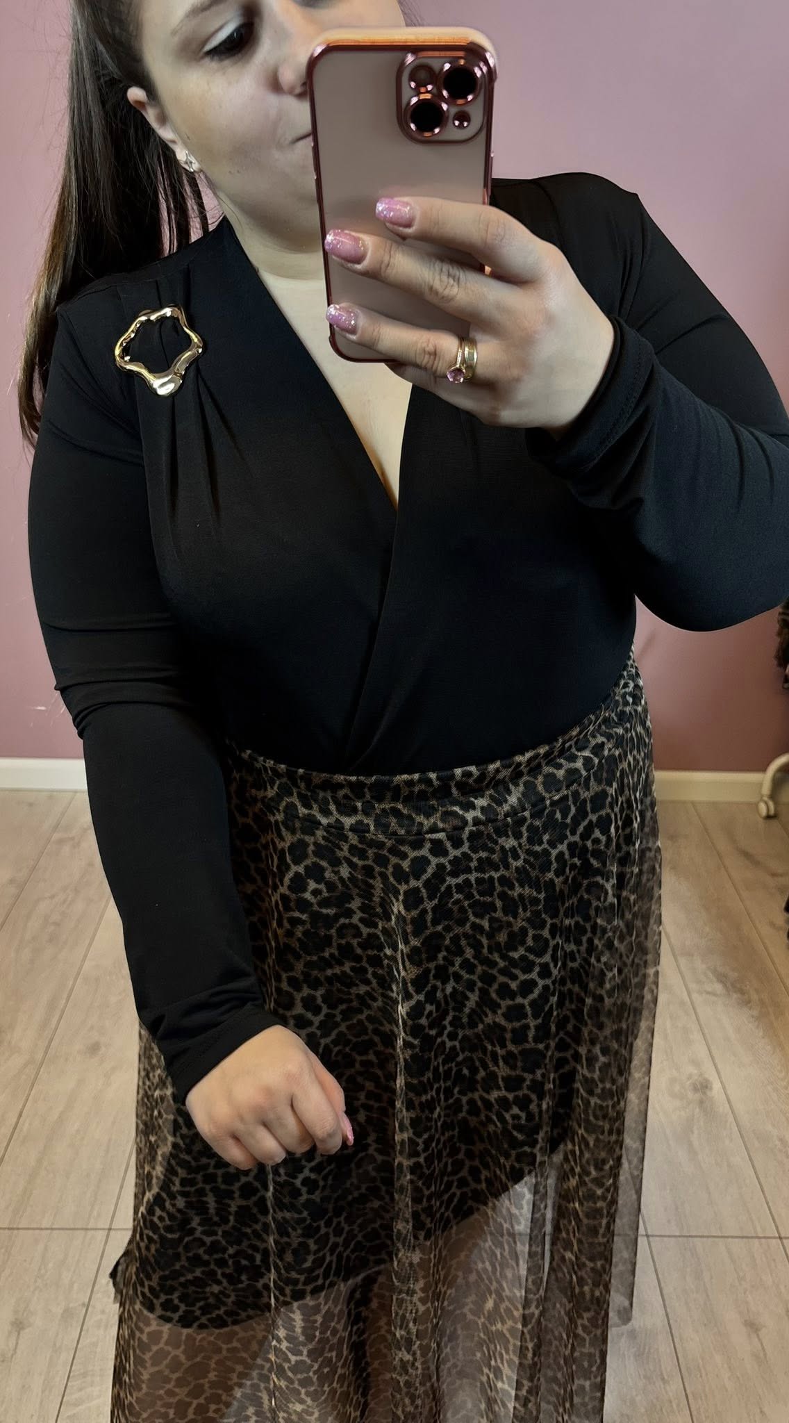 wzrost 155 cm / biust 116 cm / biodra 120 cm / na co dzień nosi rozmiar 44