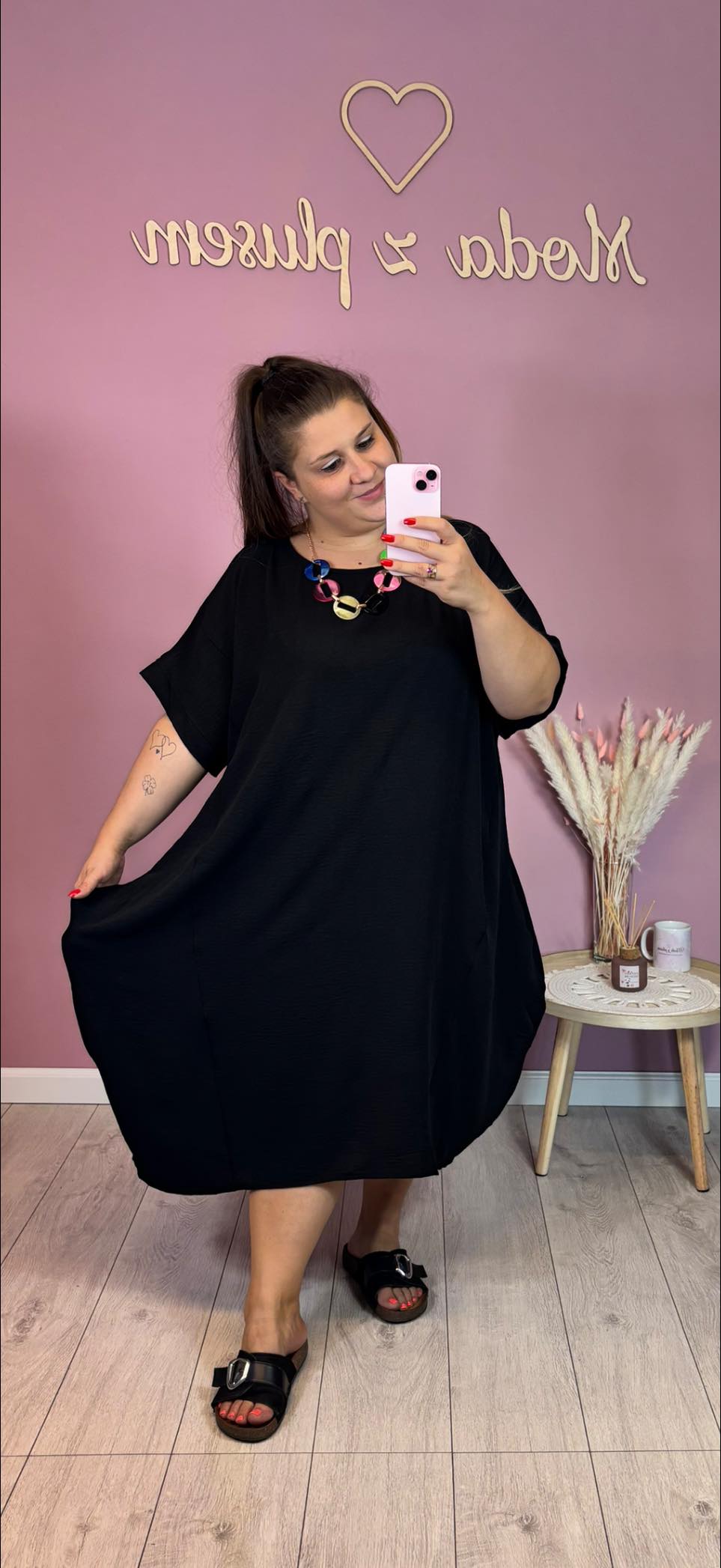 Sukienka mocno oversizowa, fajne szerokie biodra, do tego kolorowy łańcuch gratis. Nie gniecie się, materiał to wiskoza z poliestrem. Sukienka posiada kieszenie.