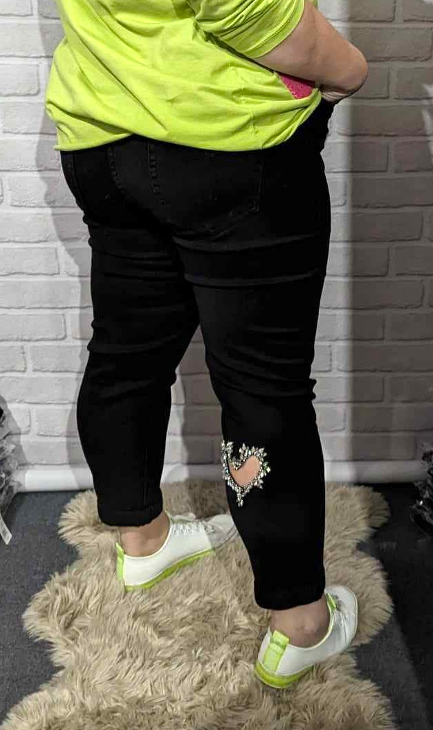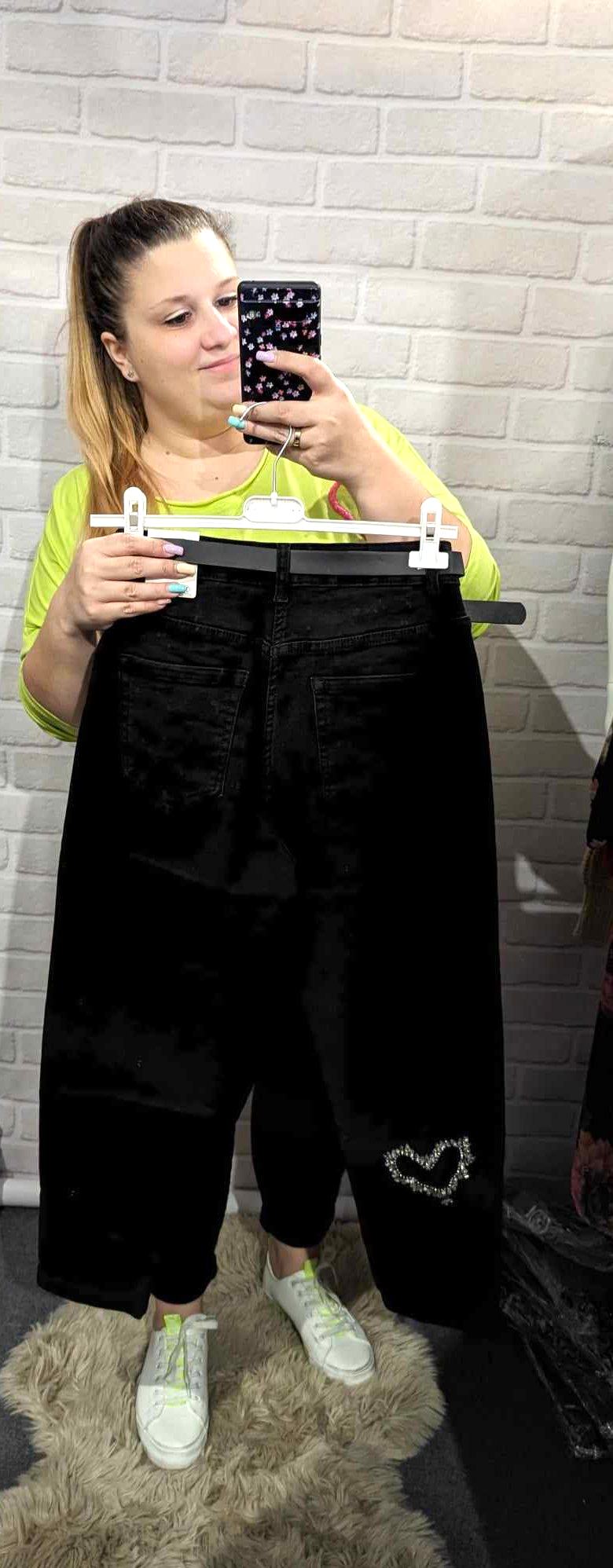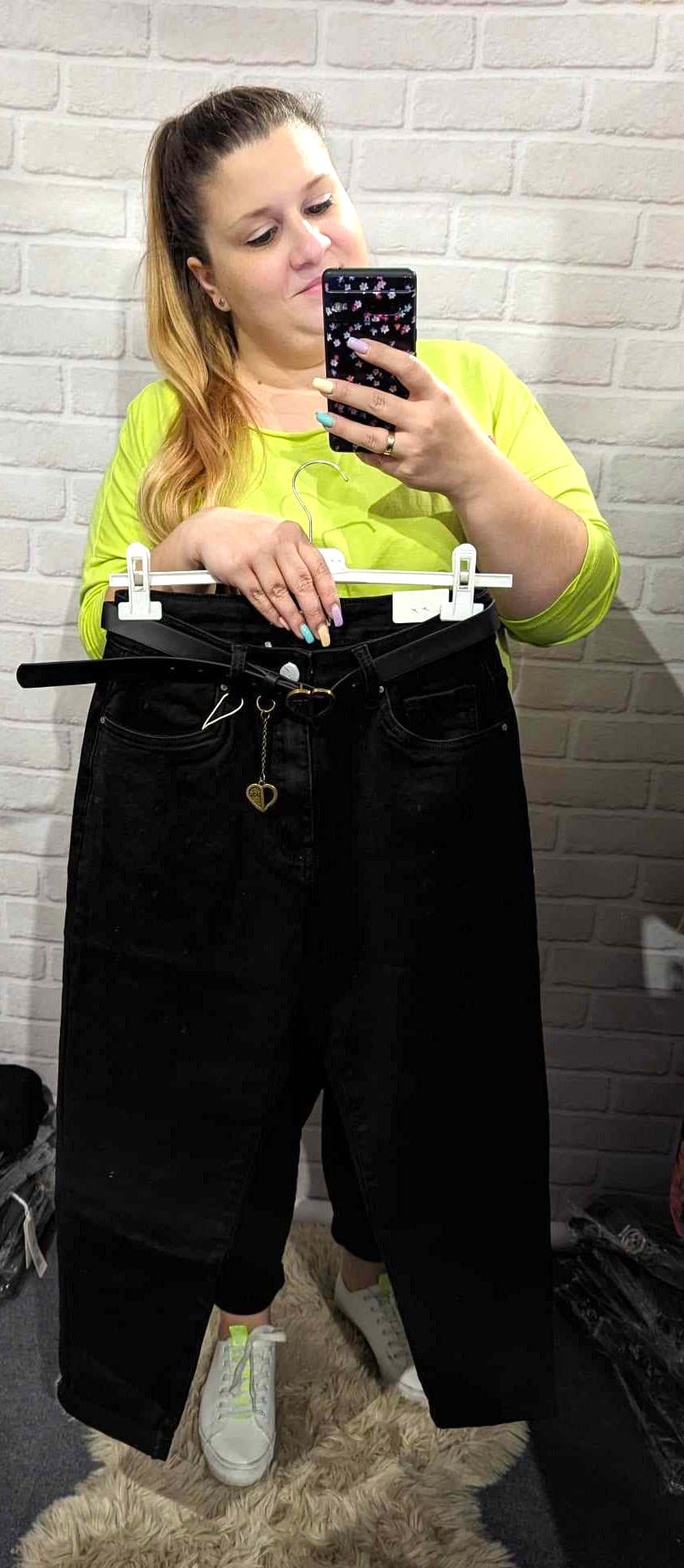 Jeansy są elastyczne, na styl mom fit (szersze w biodrach i zwężają się ku dołowi), z wysokim stanem. Długość mierzona na całkowicie odwiniętych.