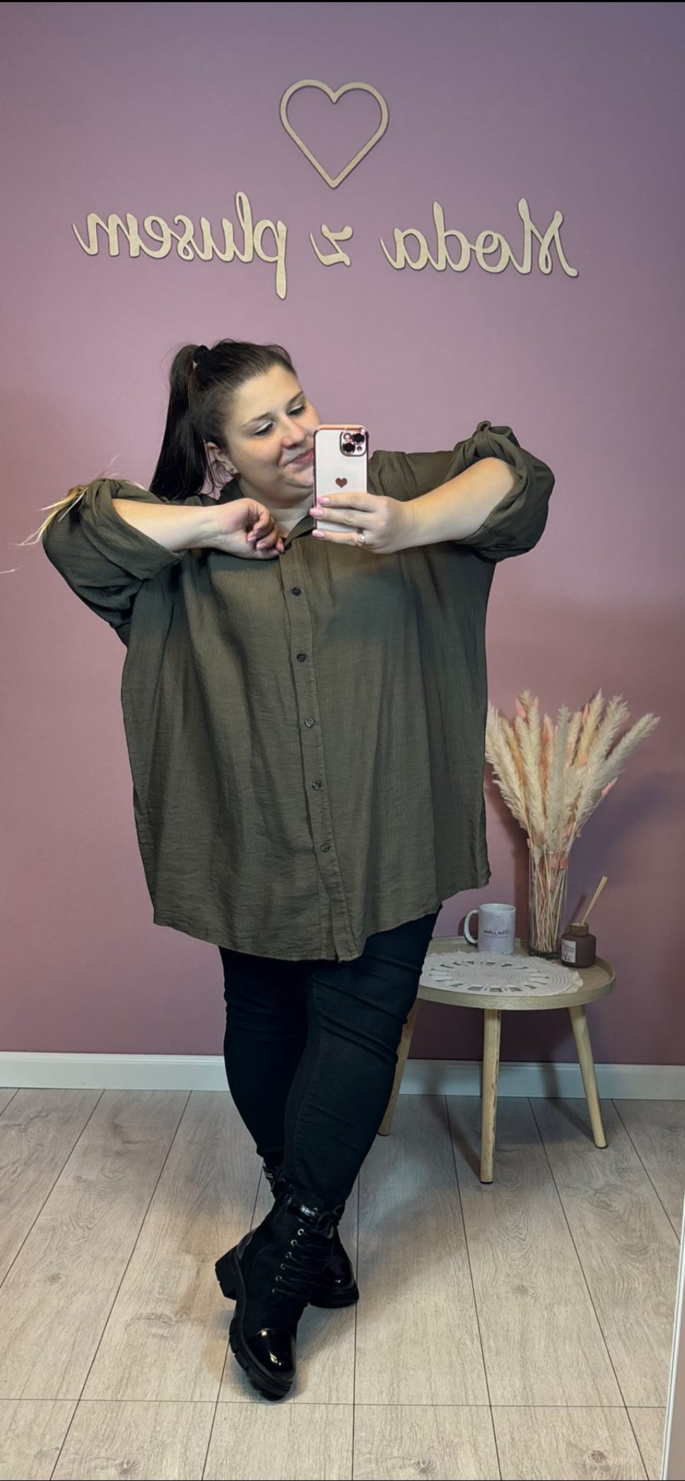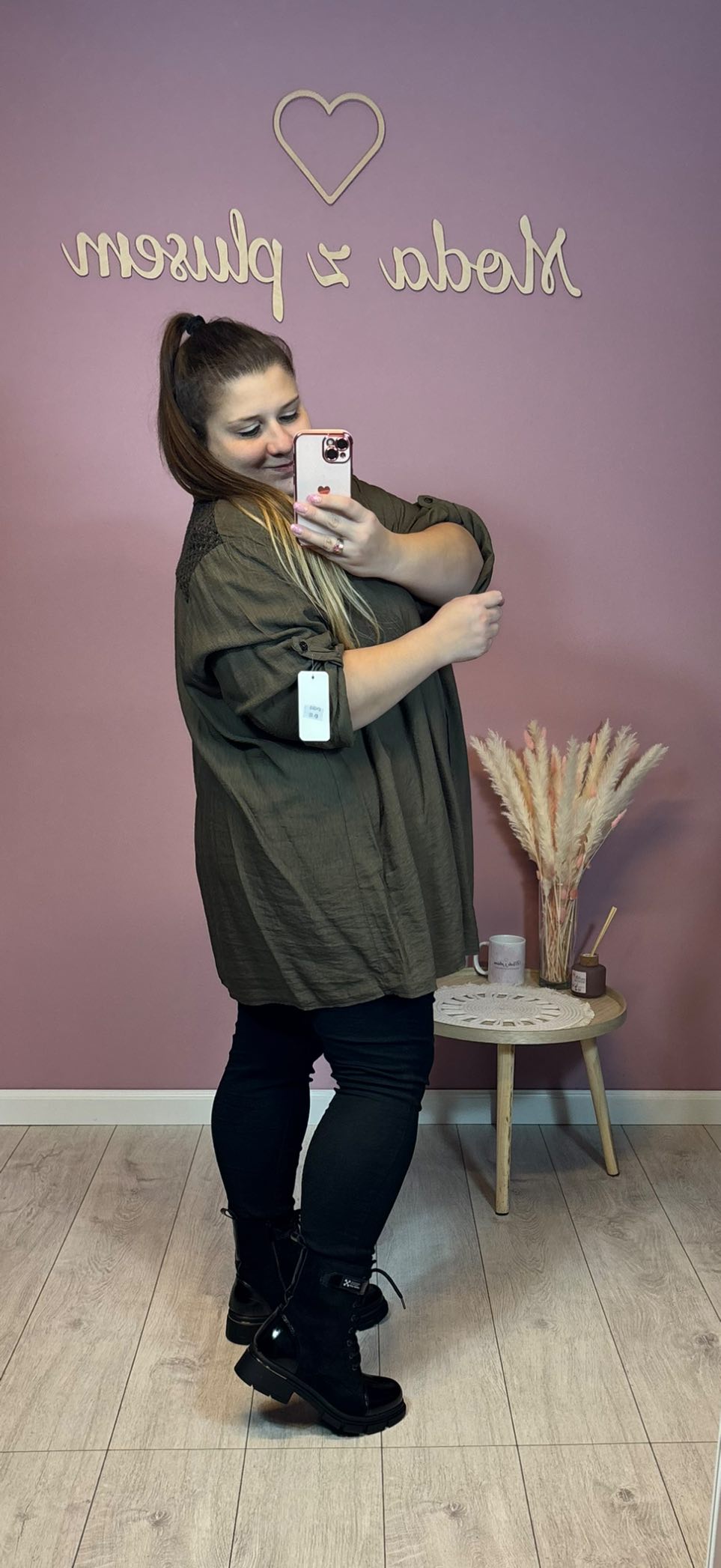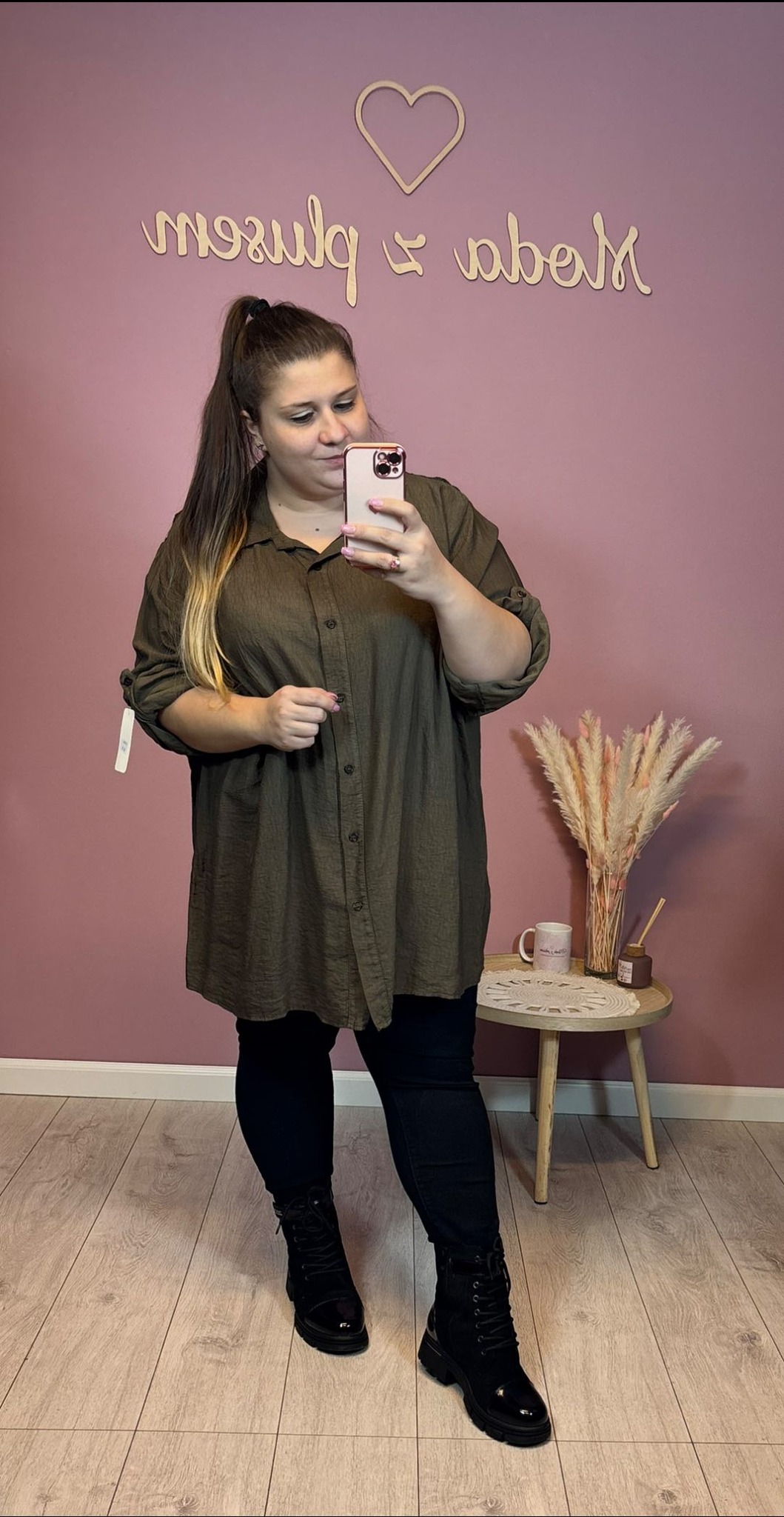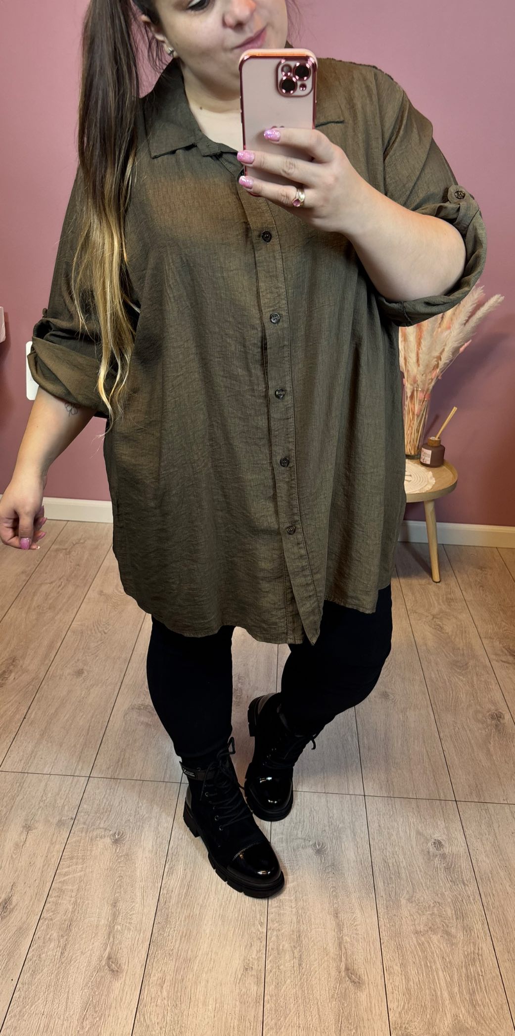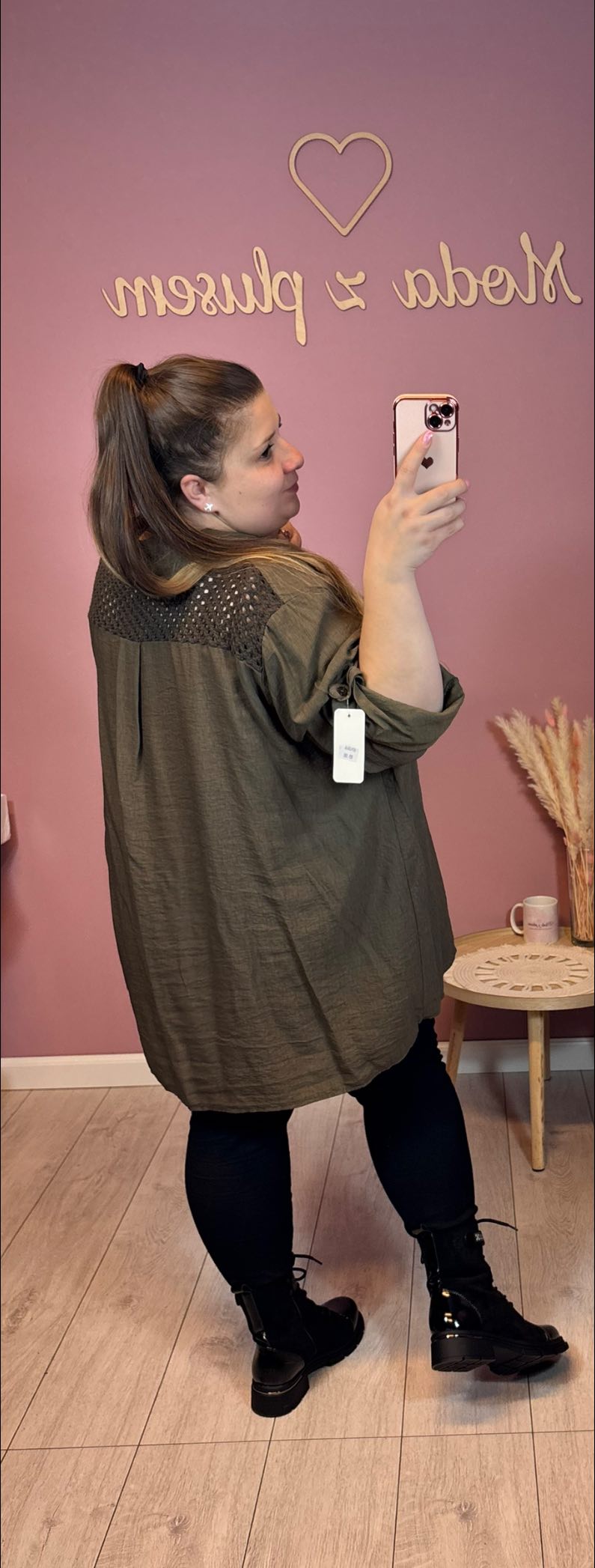 Koszula z ażurkową wstawką, model oversize. Kolor wypada między brązem, a khaki, zależy jak się spojrzy. Rękawy podpinane, można odpiąć.
