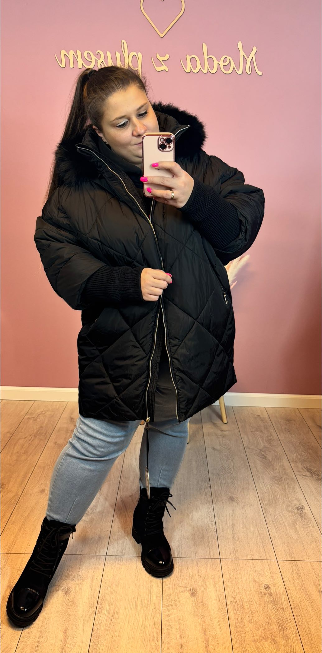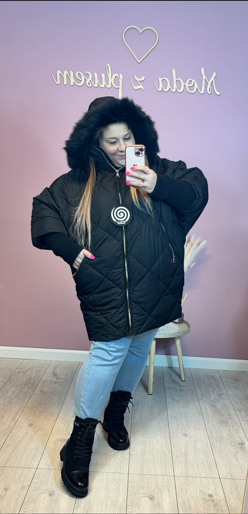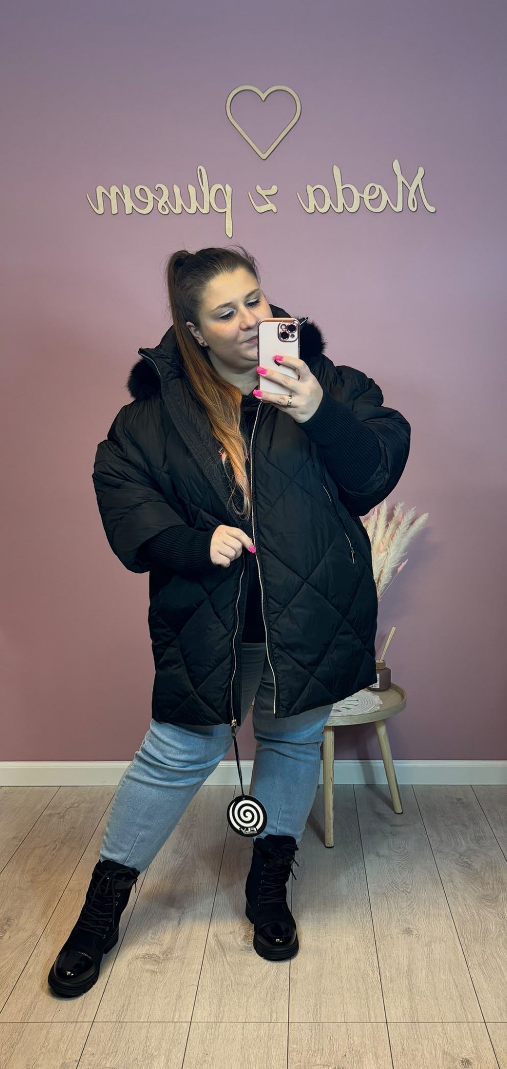 Czarna kurtka zimowa, z kapturem z futerkiem. Model nietoperz, rękaw zakończony dłuższym ściągaczem. Wypada duża, proszę nie sugerować się rozmiarem z metki tylko wymiarami!