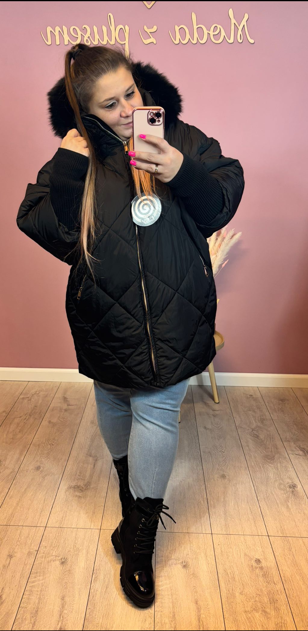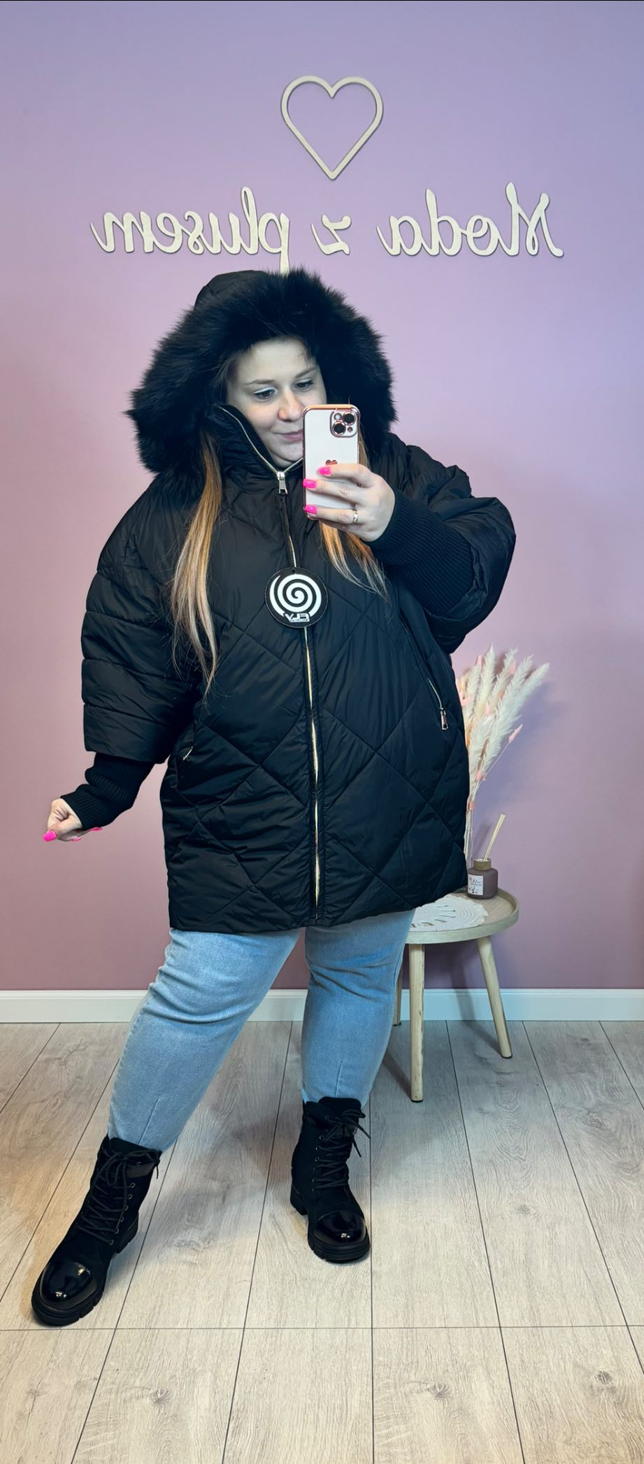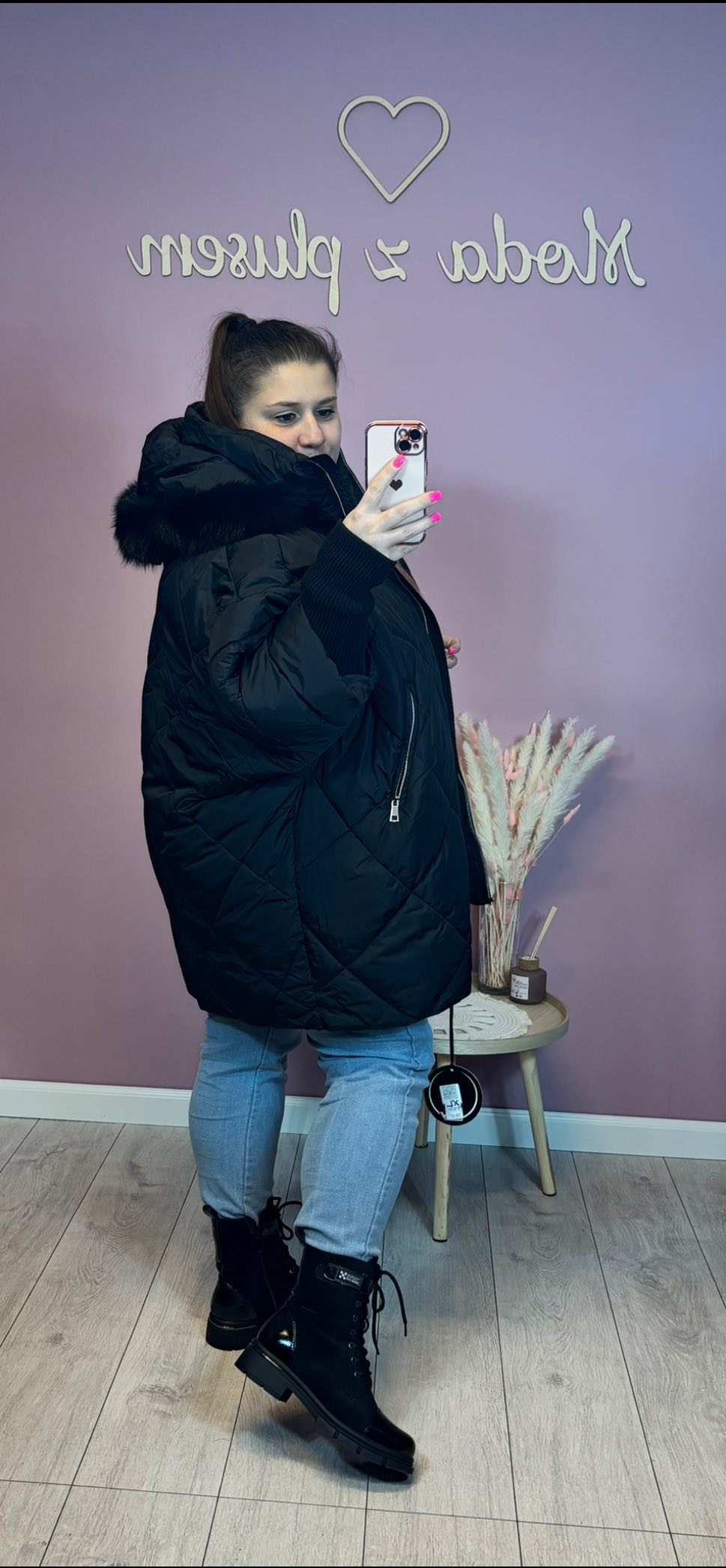 Czarna kurtka zimowa, z kapturem z futerkiem. Model nietoperz, rękaw zakończony dłuższym ściągaczem. Wypada duża, proszę nie sugerować się rozmiarem z metki tylko wymiarami!