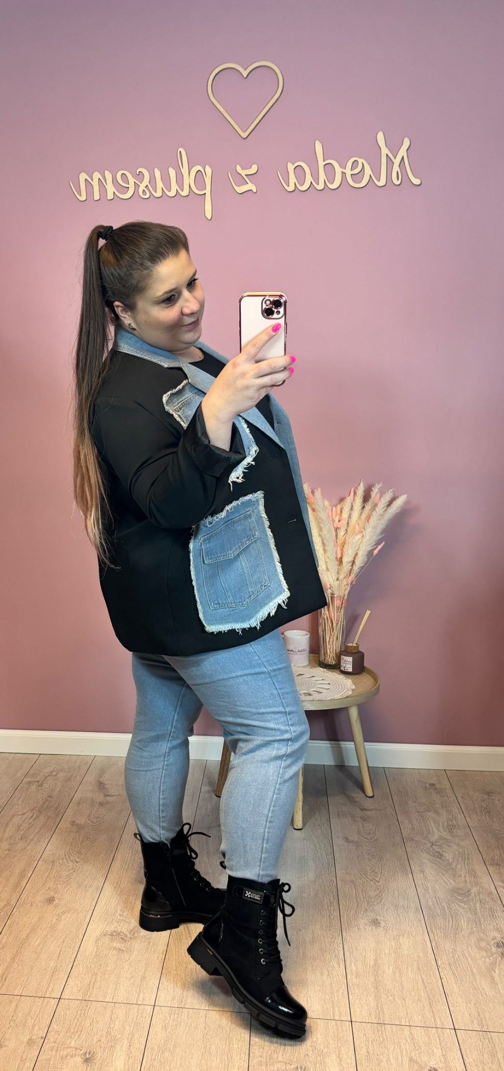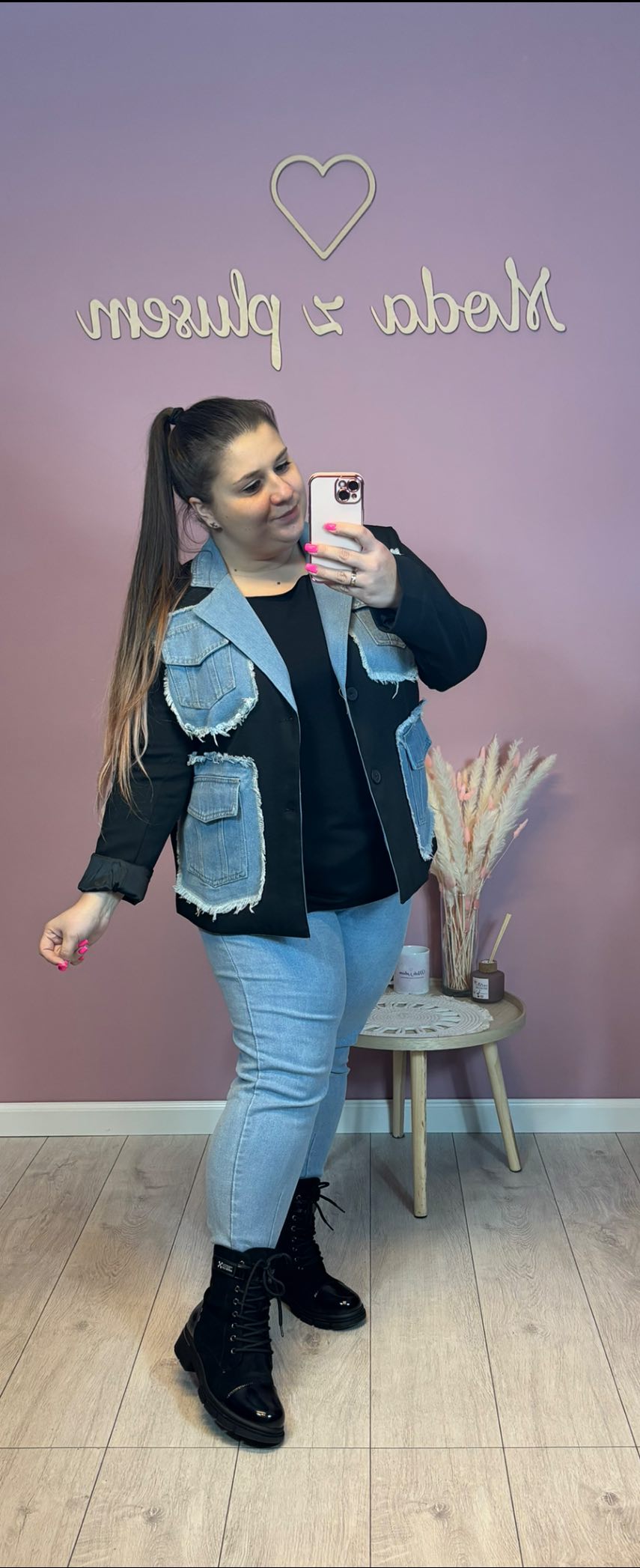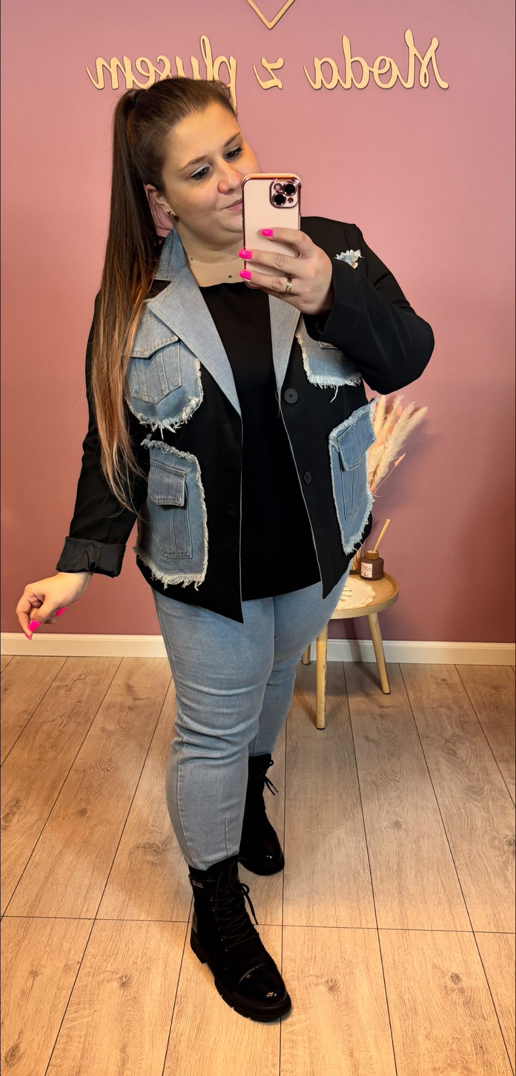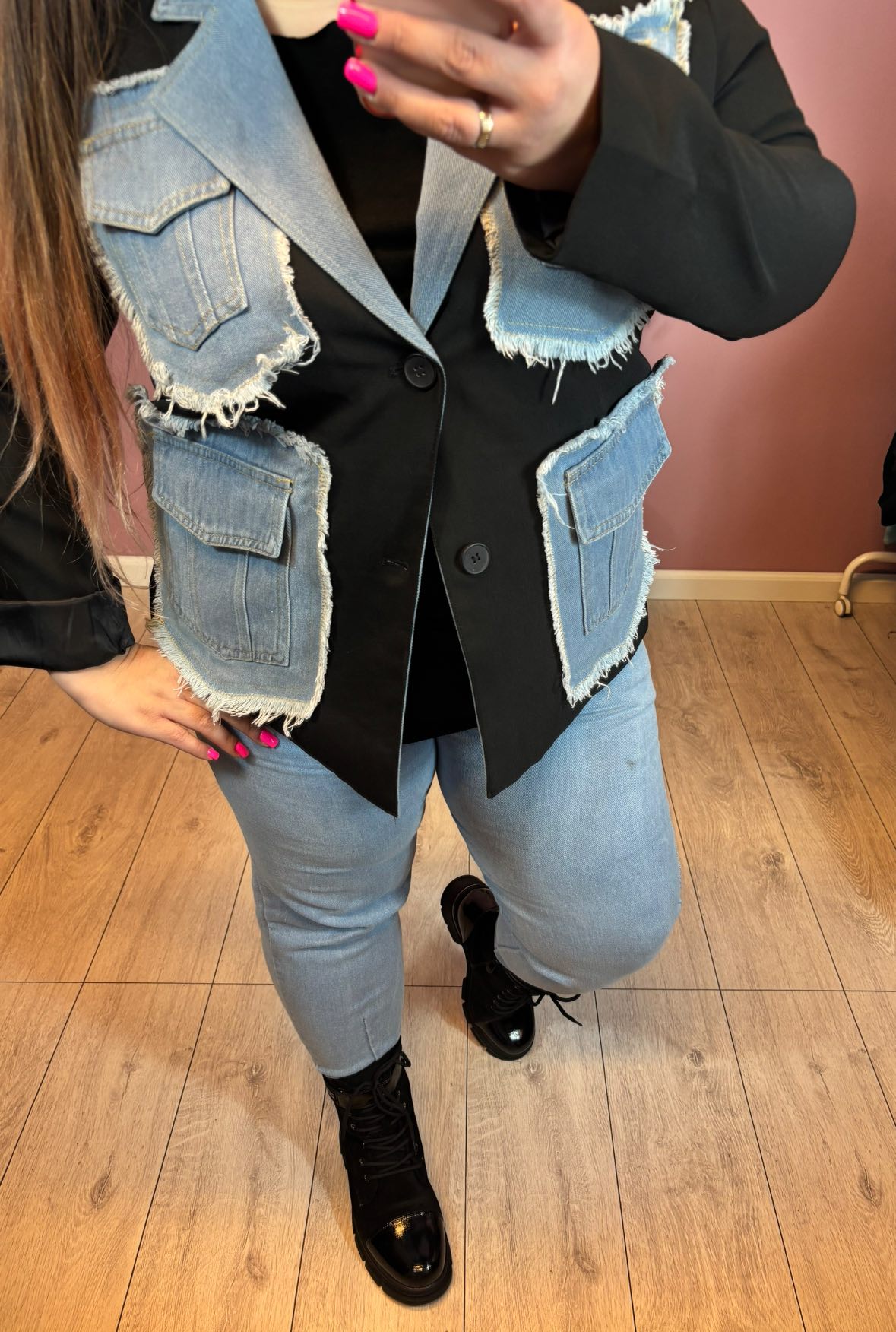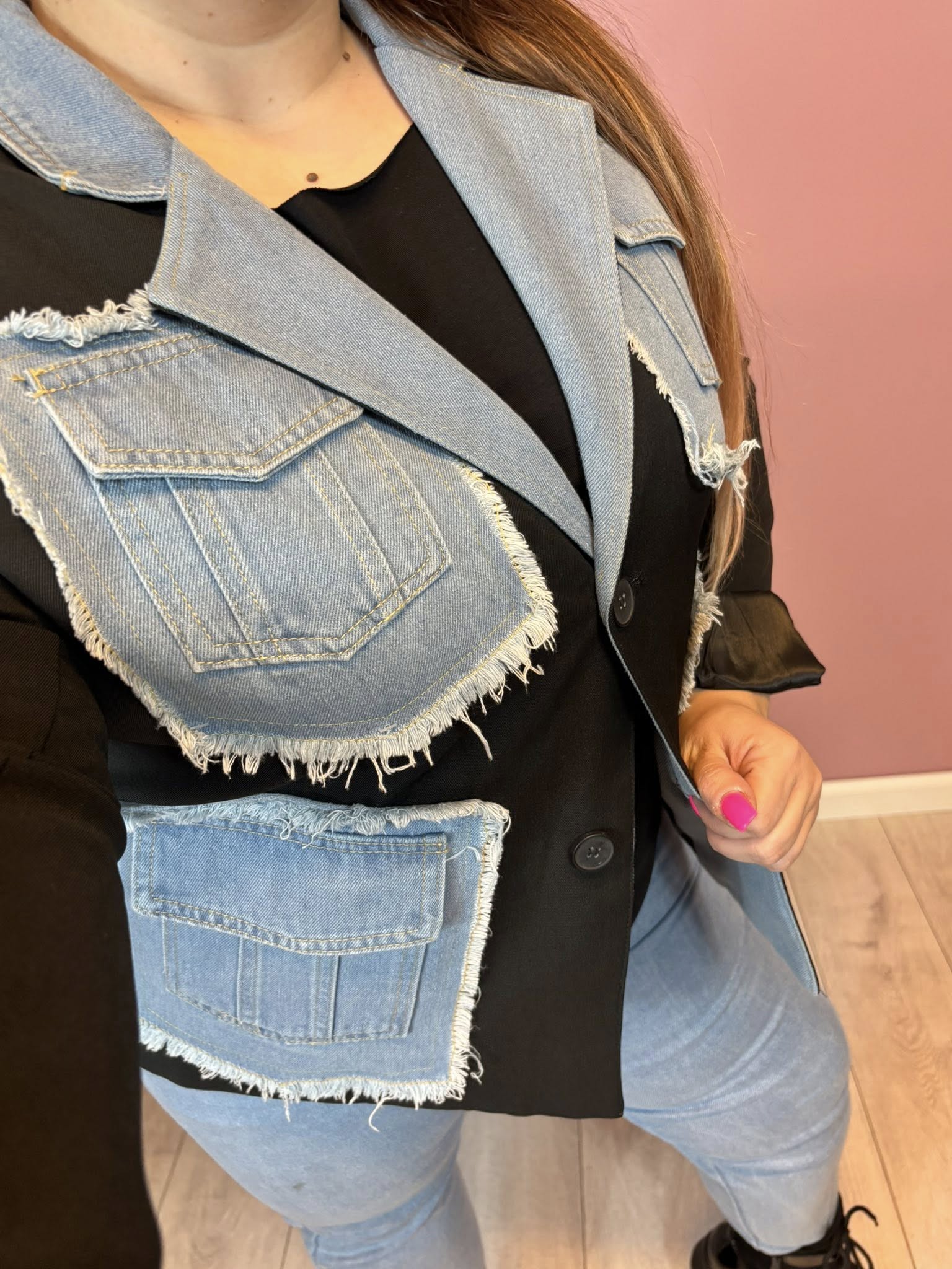 Niepowtarzalna, oryginalna oversizowa marynara czarna z jeansem. Model oversize.