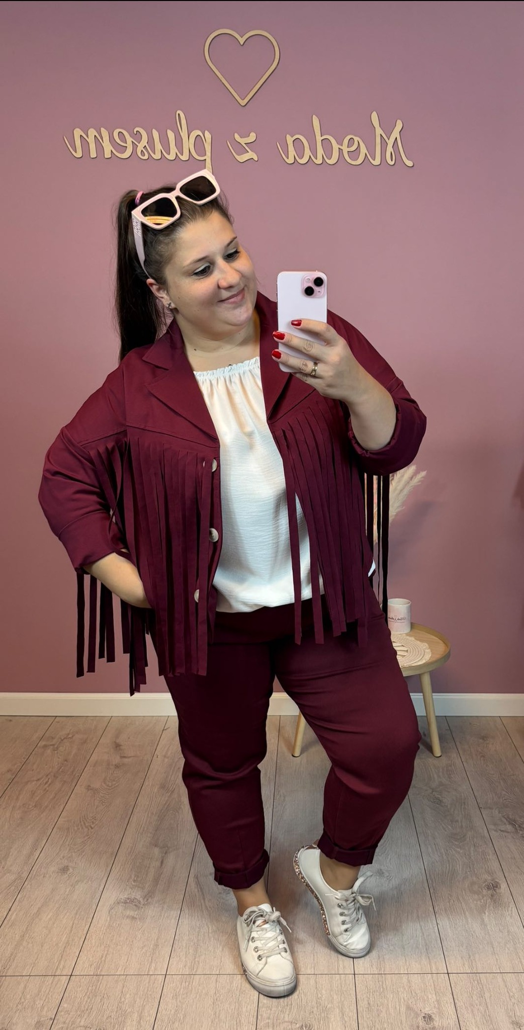Bordowa narzutka, zapinana. Z przodu i z tyłu frędzle. Będzie idealna do kompletu ze spodniami Livan’s.