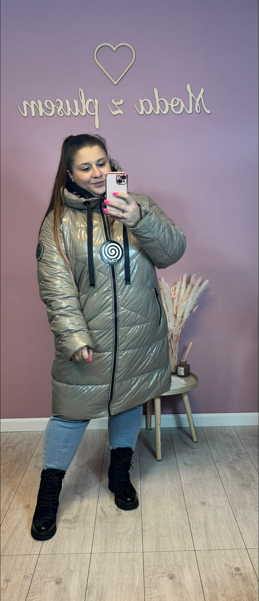 Bardzo ciepły i świetny jakościowo płaszcz. Posiada zasuwane kieszenie, przyciągany kaptur, w rękawach posiada gumkę. Kolor beżowy z czarną podszewką. Model oversize.