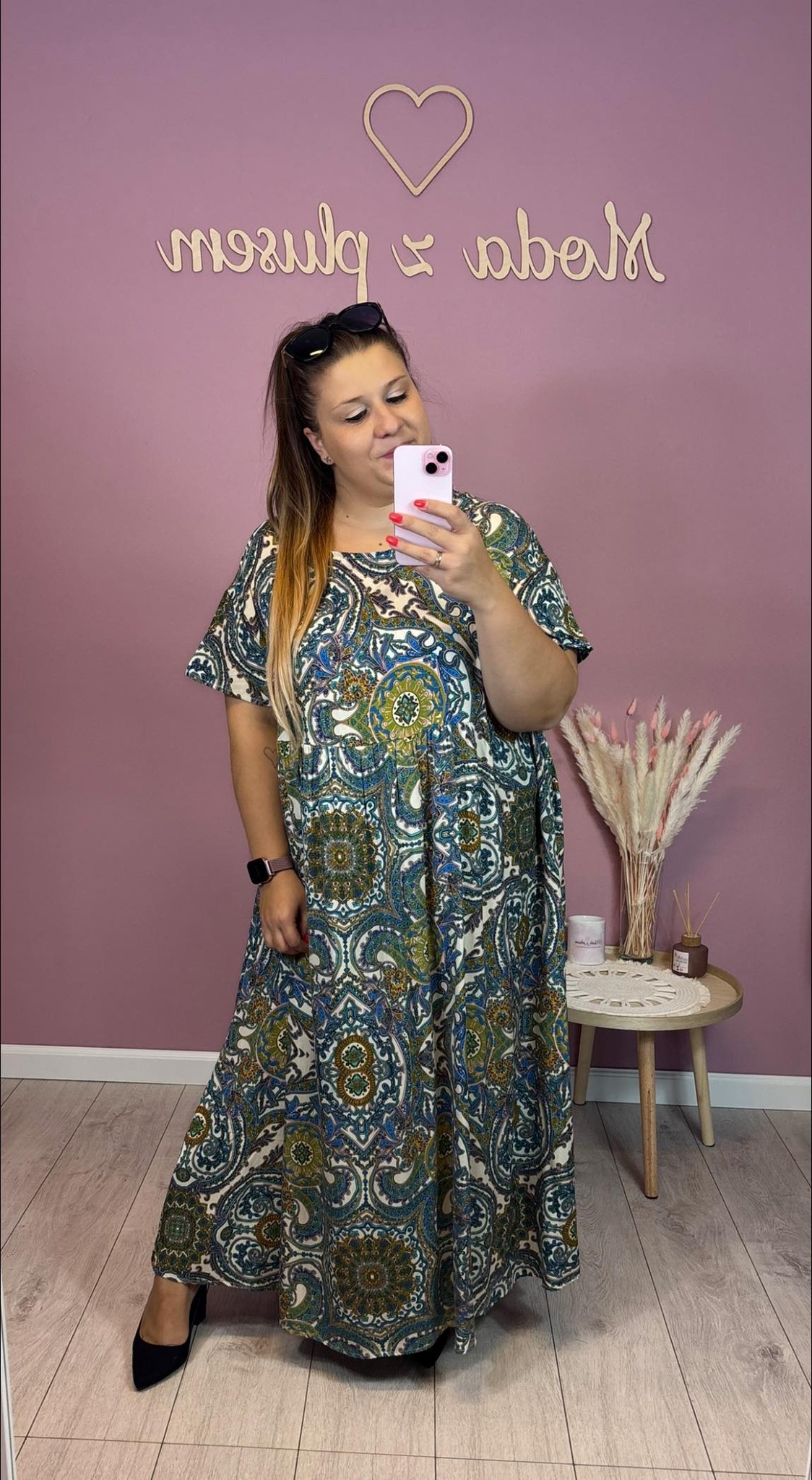 Sukienka odcinana, z kieszeniami, szeroka w biodrach. Model z wiskozy – jest zwiewna, cienka.