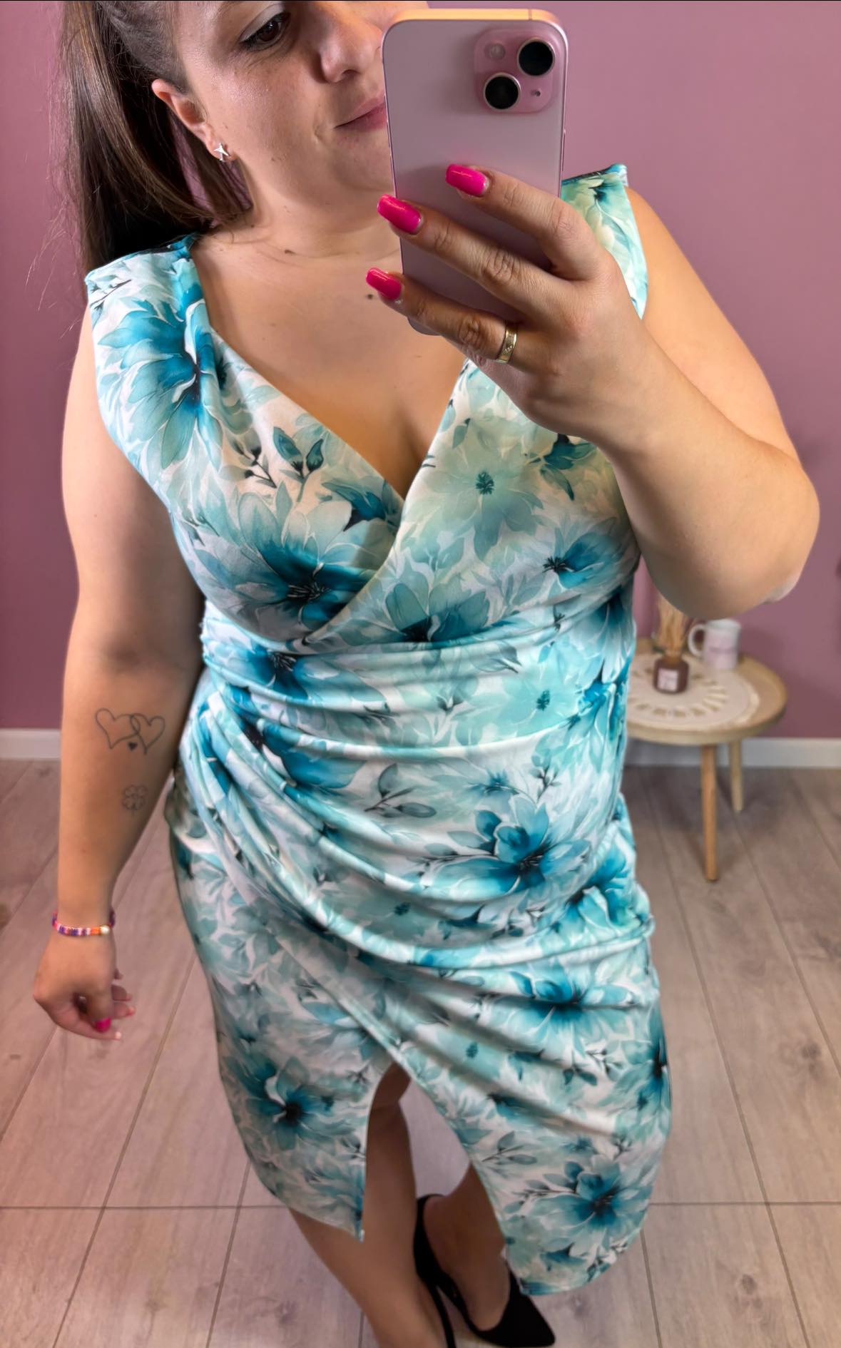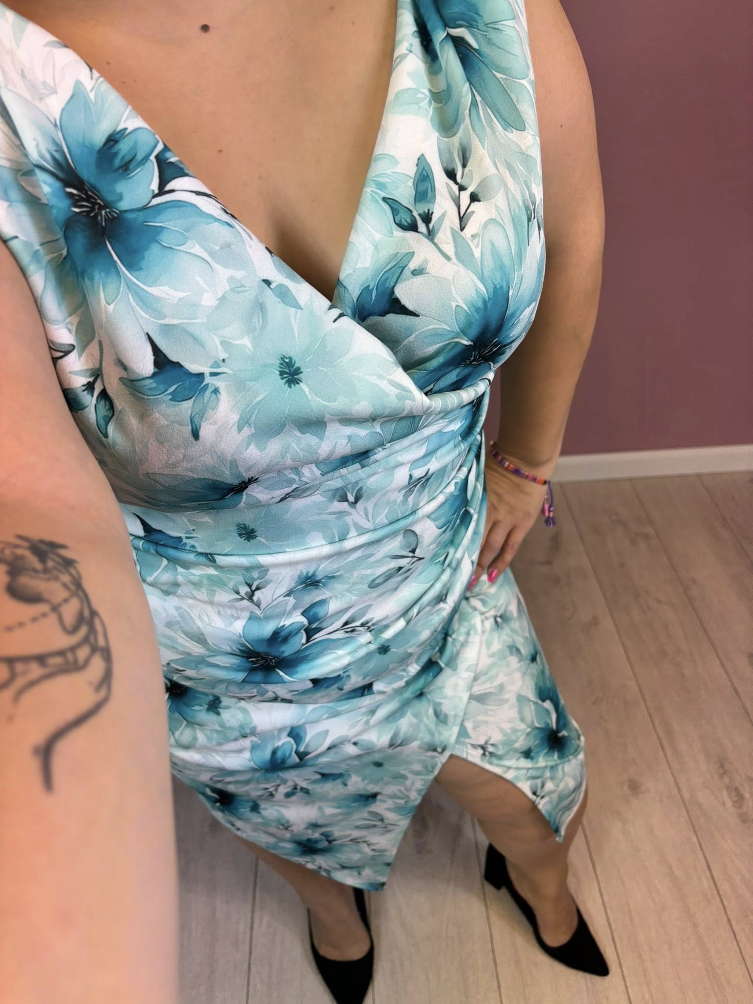 Sukienka na ramiączkach, marszczona na brzuchu. Ma większy dekolt i piękne rozcięcie na dole.