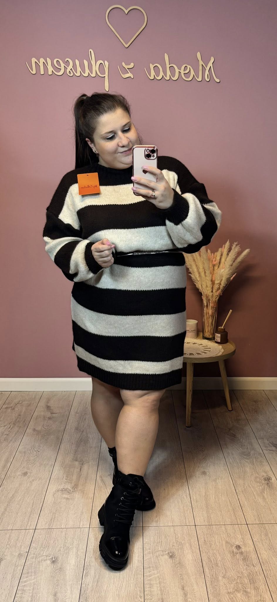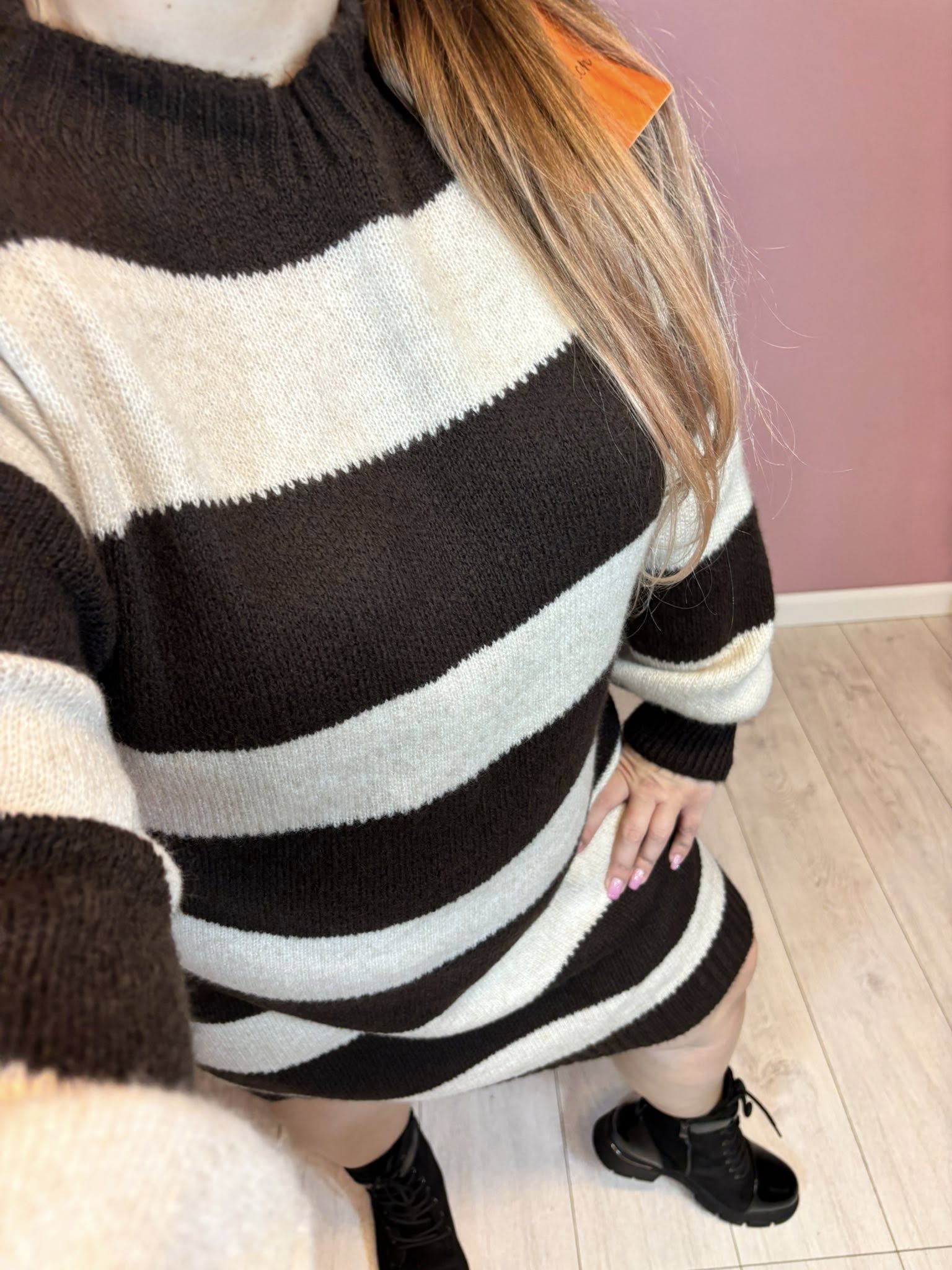 Sukienka lub tunika – jak kto woli – cieplutka, miła w dotyku. Kolor ecru+czekolada. Pasek nie jest w zestawie.