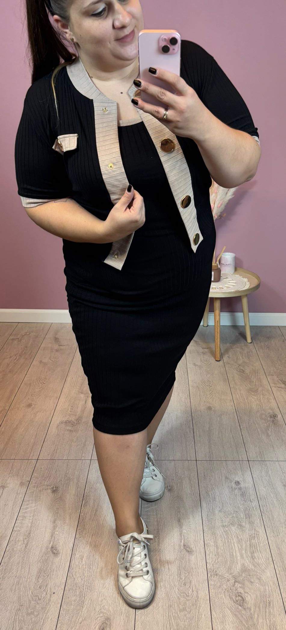 Bawełniana sukienka prążek, na grubych ramiączkach, dodatkowo narzutka zapinana na guziki – napy. Model mniejszy, ale rozciągliwy.