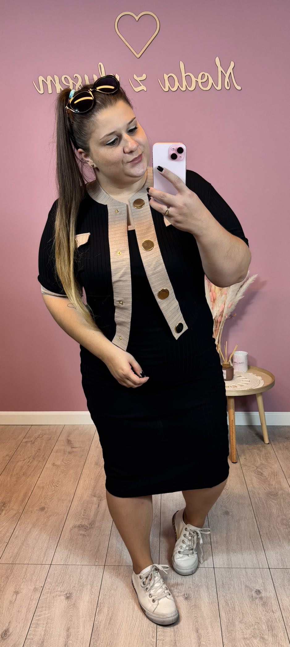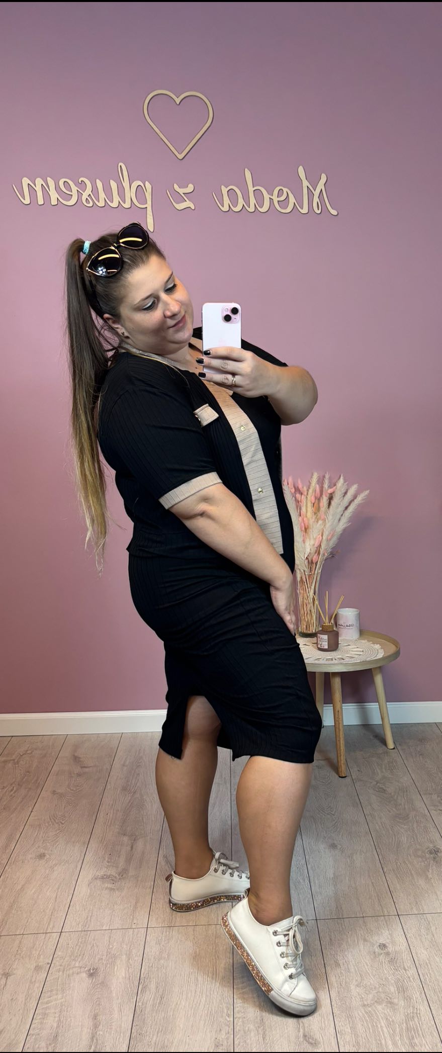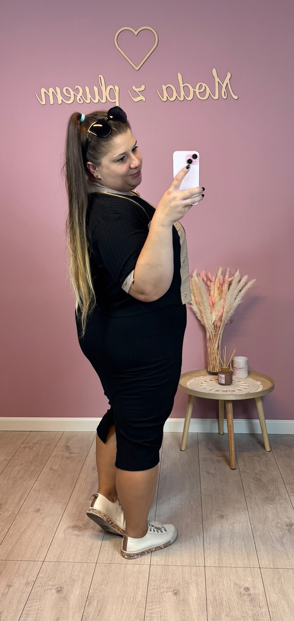wzrost 155 cm / biust 116 cm / biodra 120 cm / na co dzień nosi rozmiar 44
