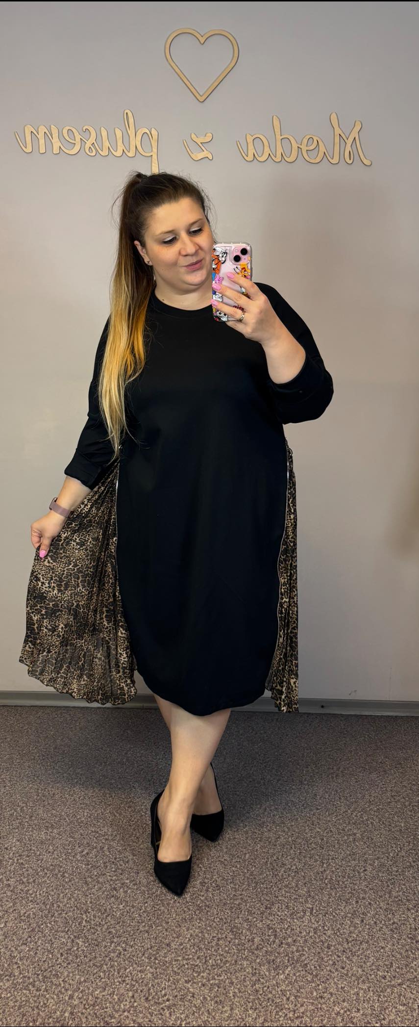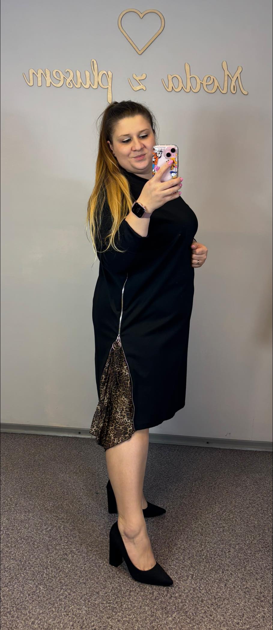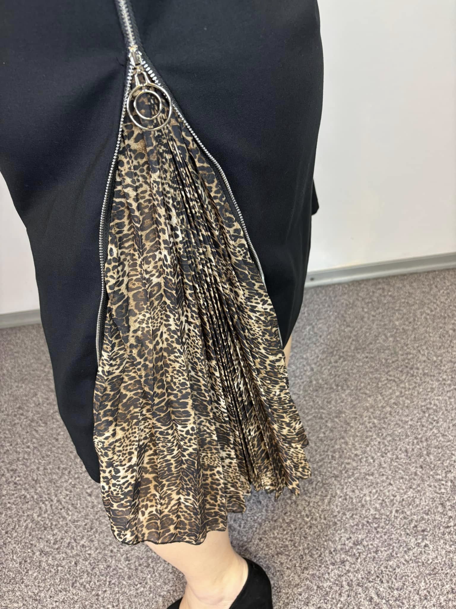 Sukienka czarna z wystającymi wstawkami z drobnej panterki. Suwakiem można regulować, ile panterki będzie wystawać.