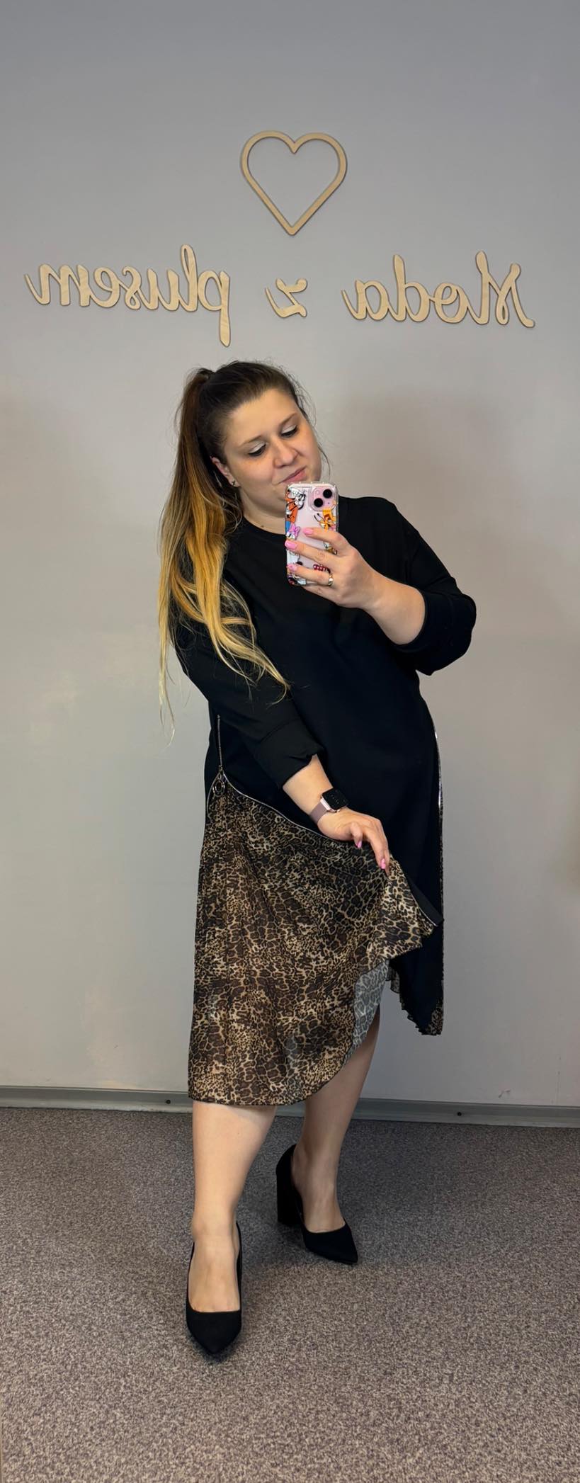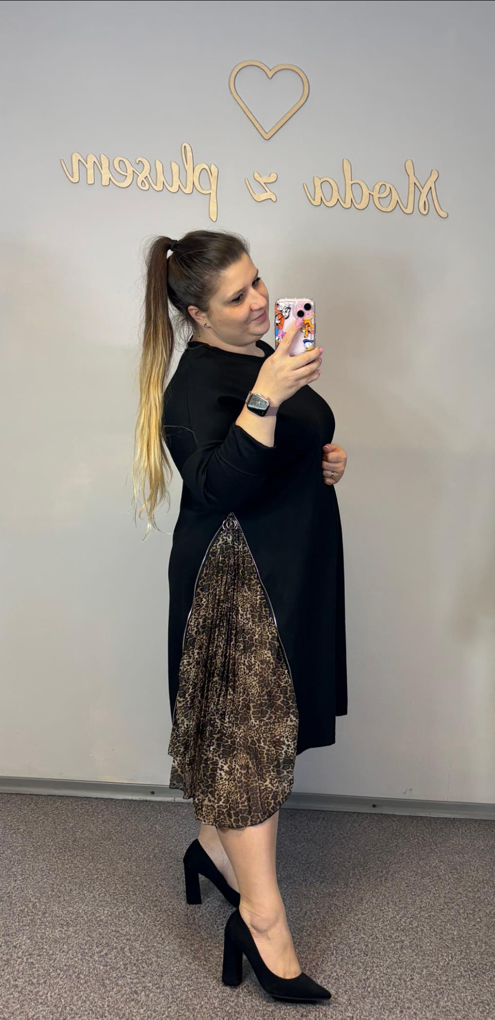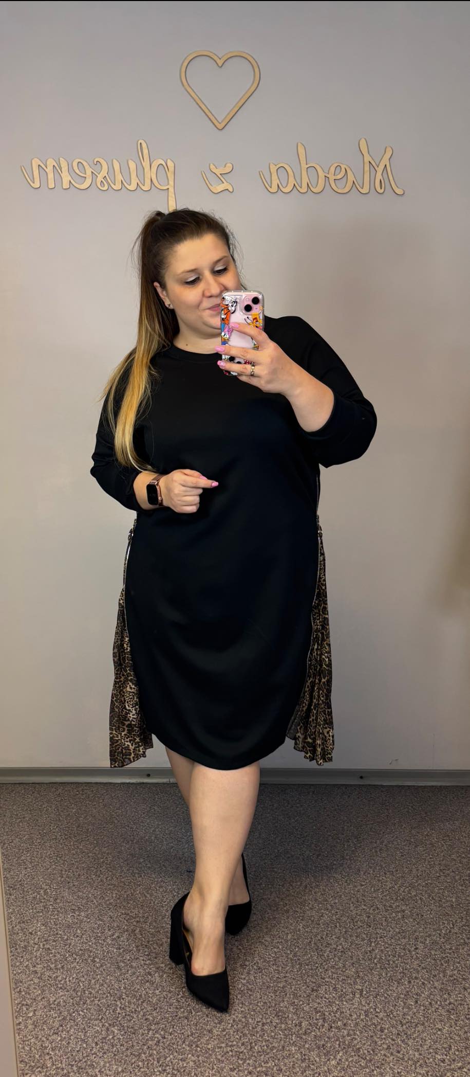 Sukienka czarna z wystającymi wstawkami z drobnej panterki. Suwakiem można regulować, ile panterki będzie wystawać.