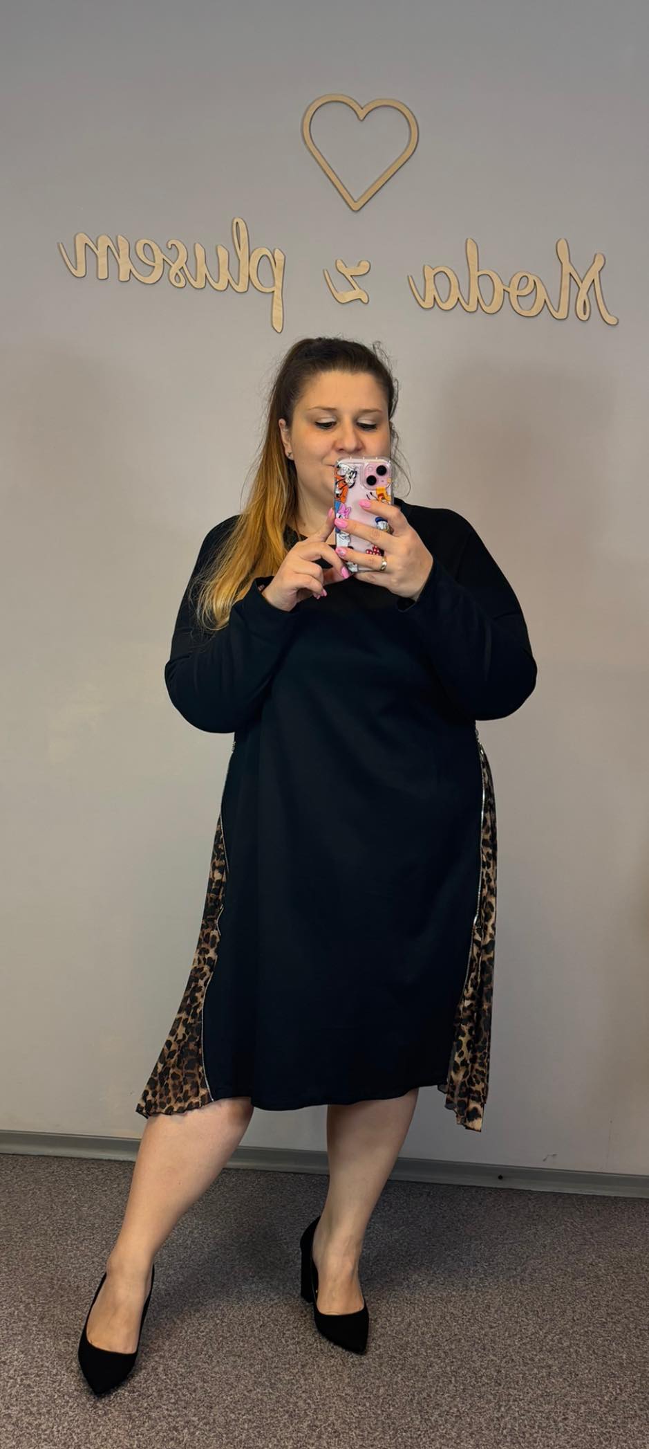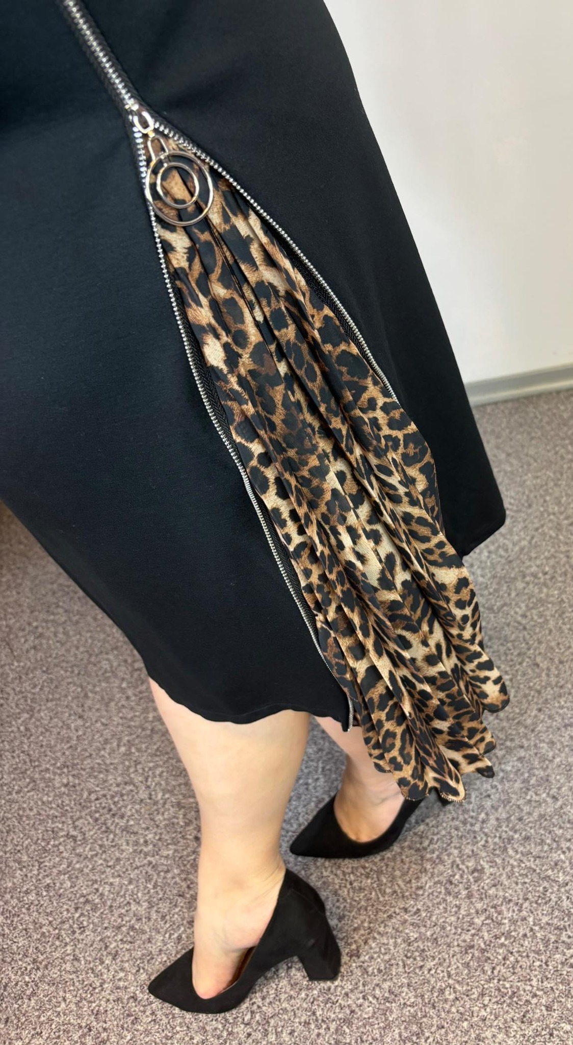 Sukienka czarna z wystającymi wstawkami z większej panterki. Suwakiem można regulować, ile panterki będzie wystawać.