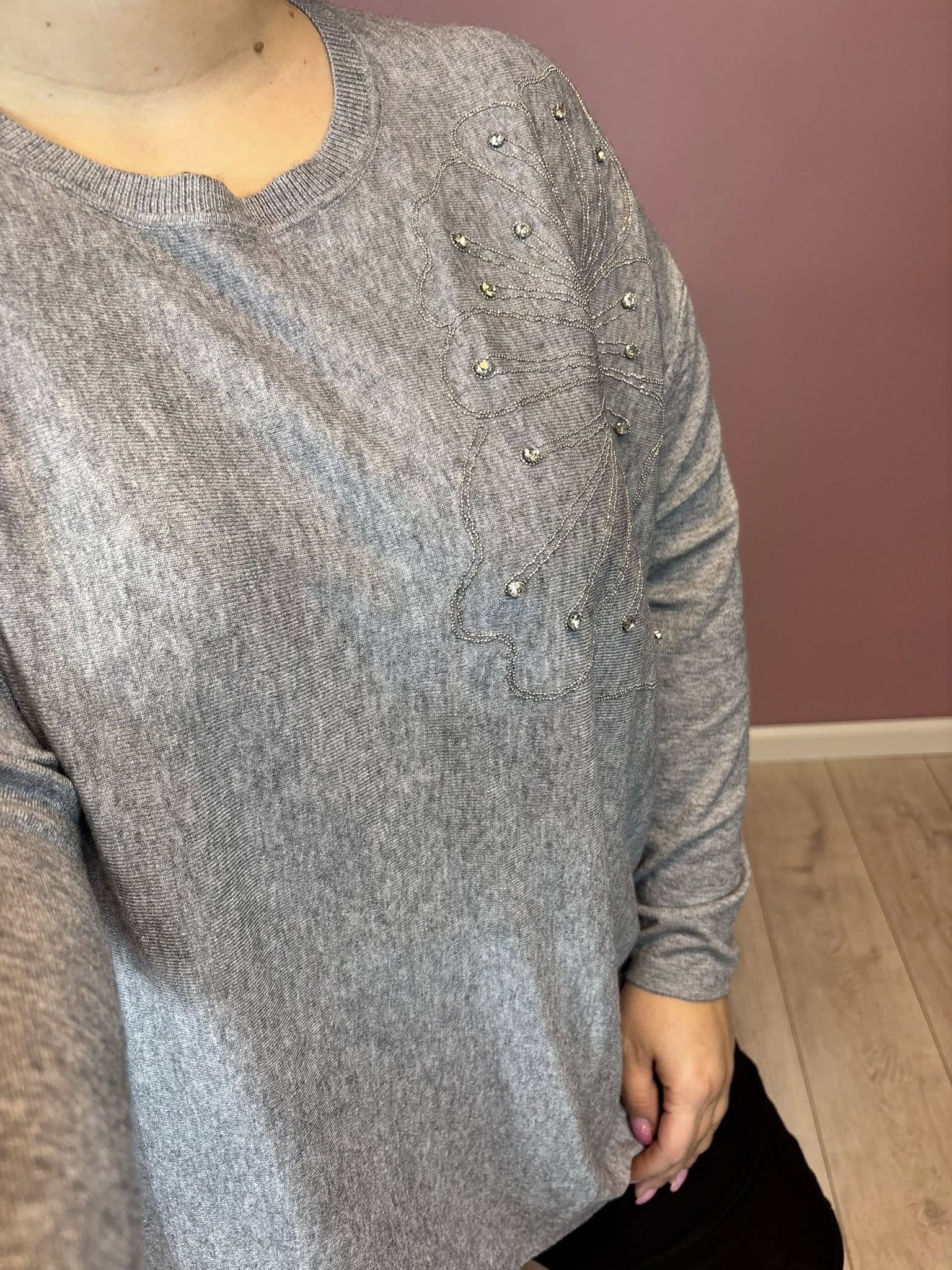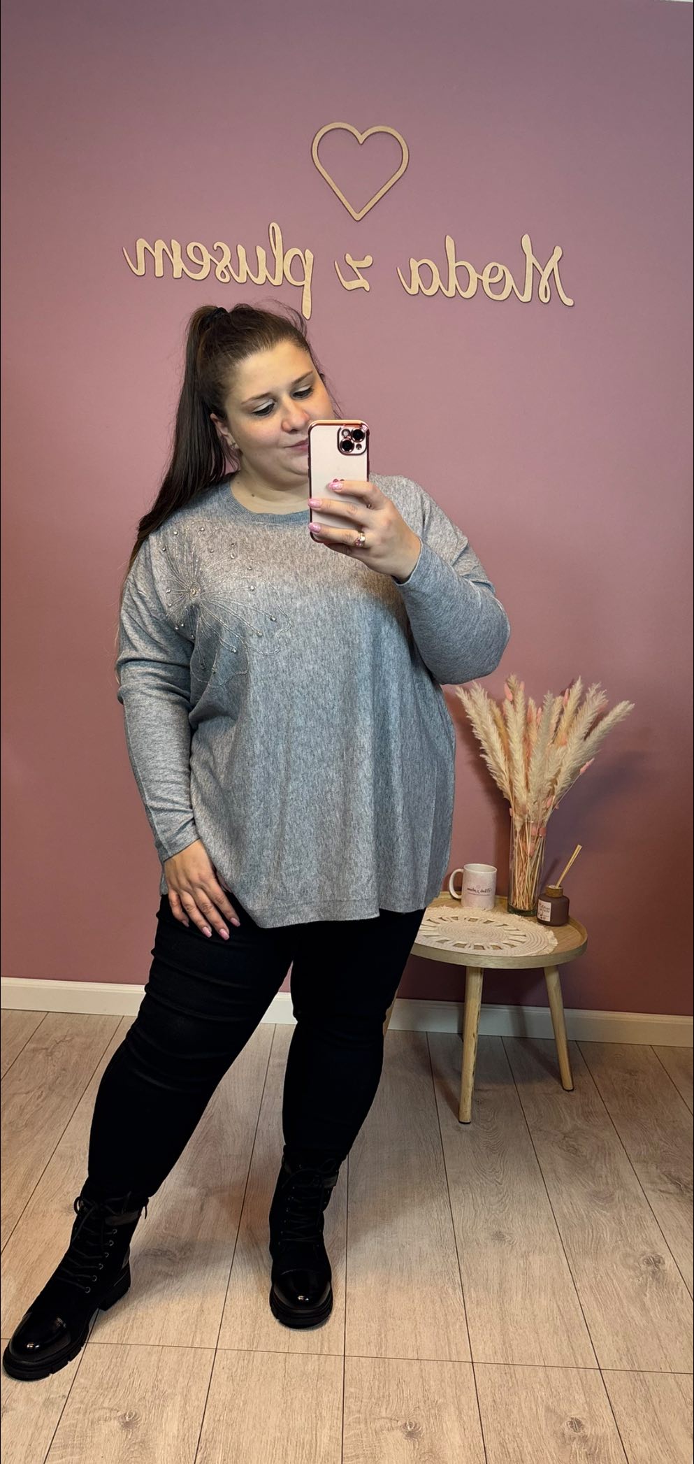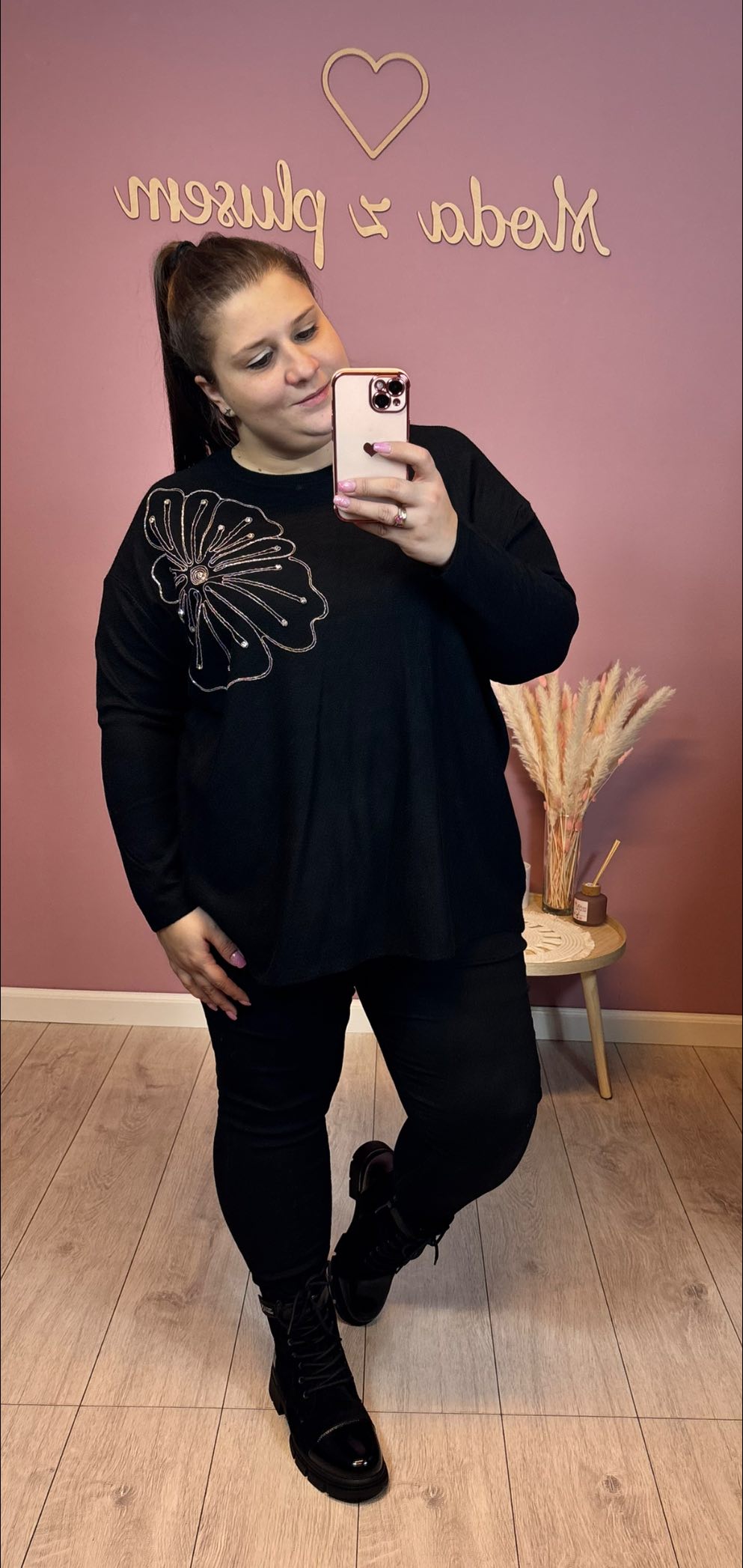 Sweterek z kwiatkiem na boku. Mocno oversize, ale super się układa nawet na mniejszym rozmiarze. Jest miły i cienki.