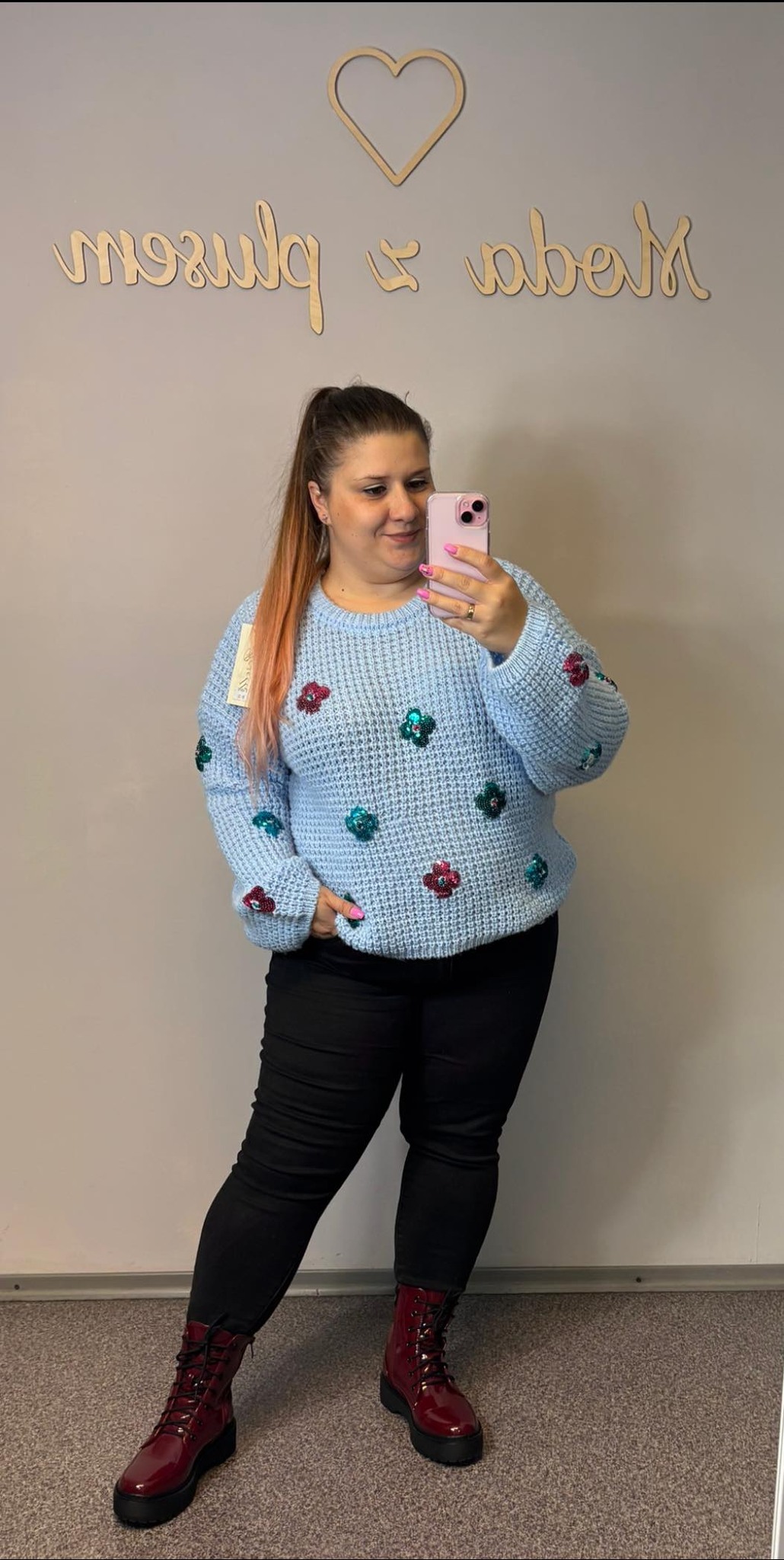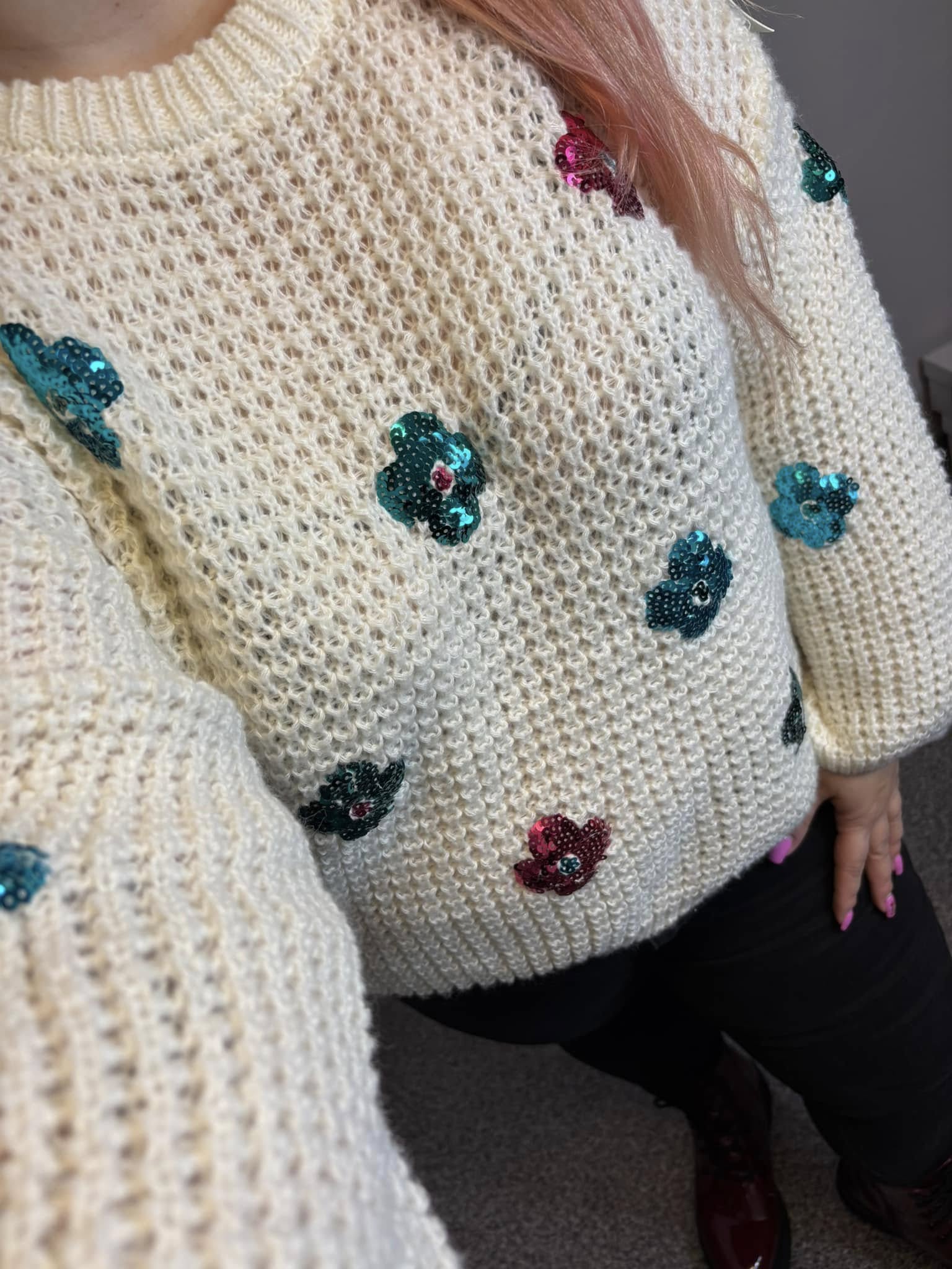 Sweter w kwiatuszki z cekinów. Bardzo miły w dotyku, w oversizowym kroju.