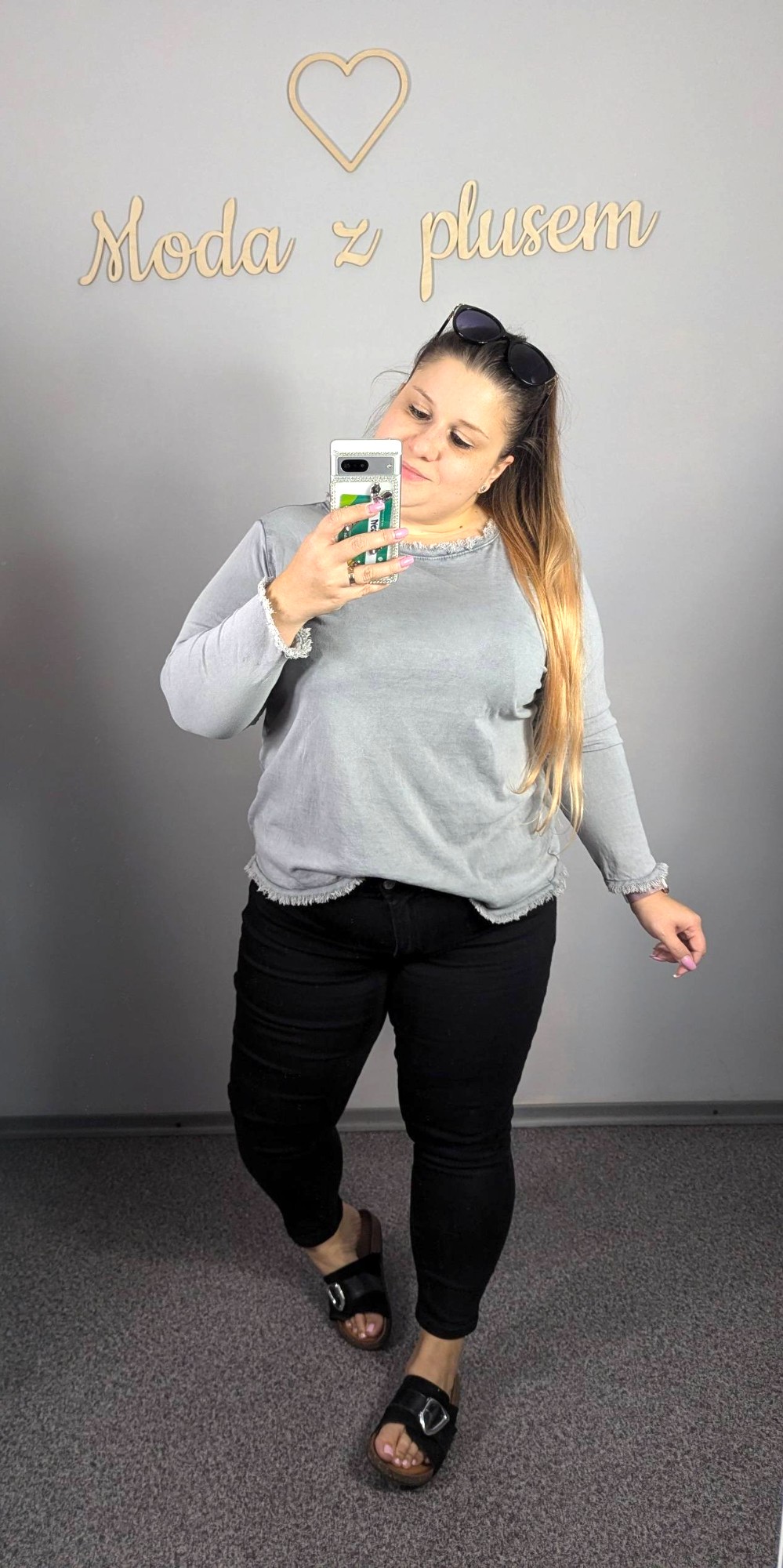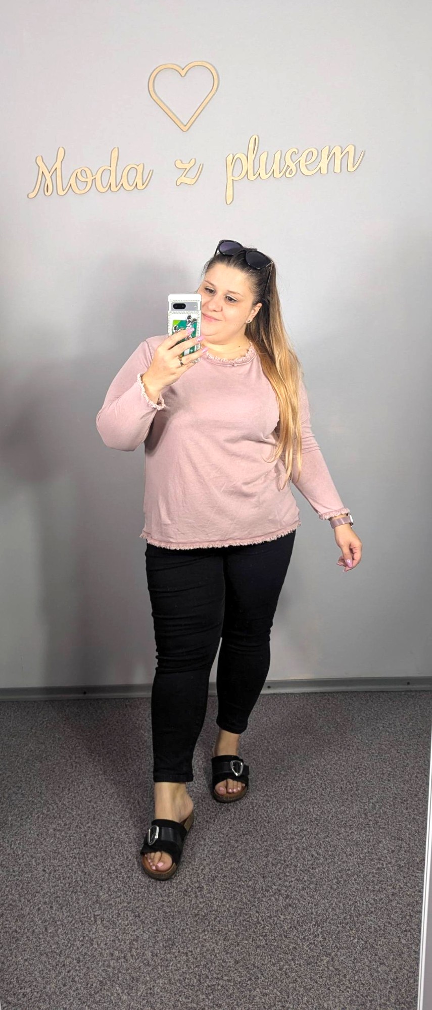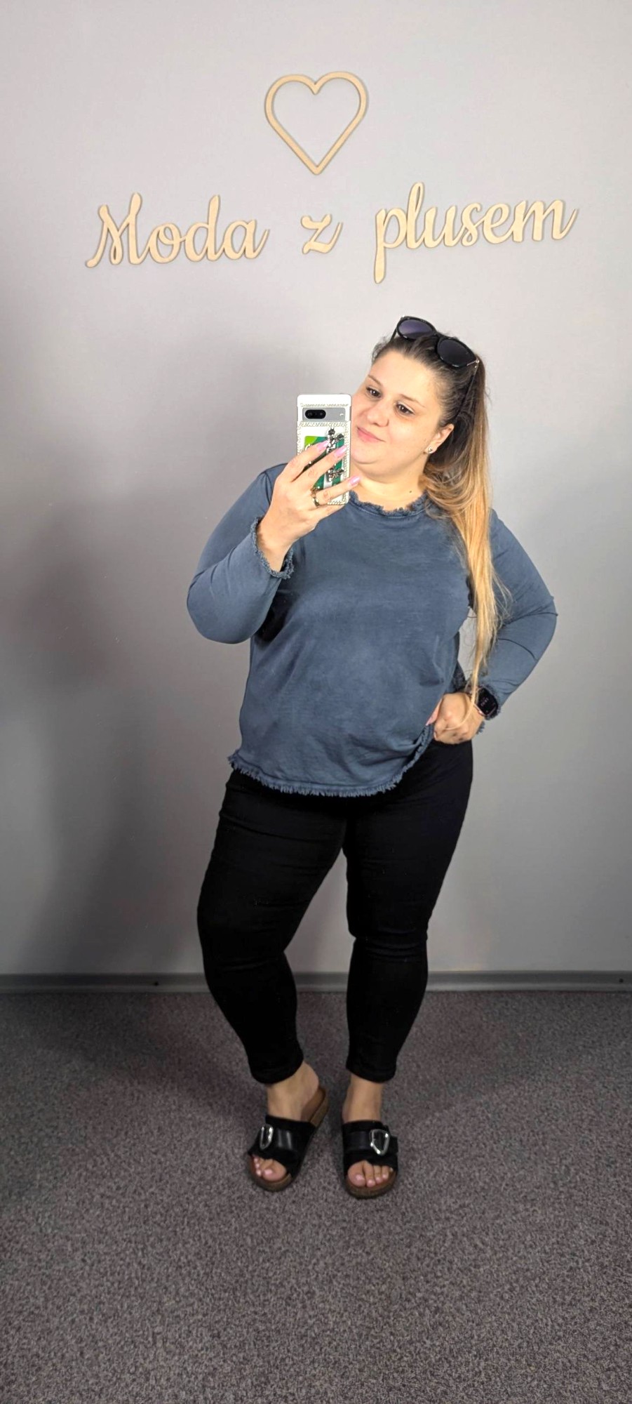 Bluzka jest bawełniana, posiada poszarpany dekolt, dół i rękawy, model jest miękki, wygodny, z długim rękawem.