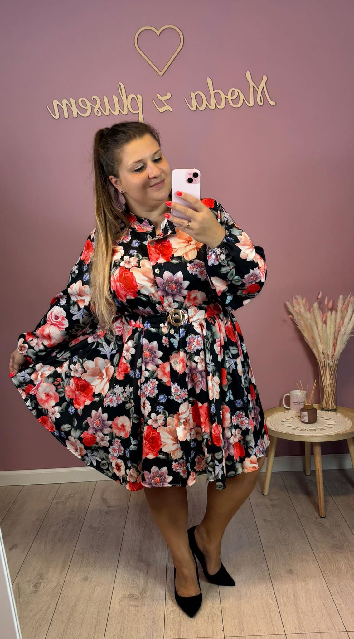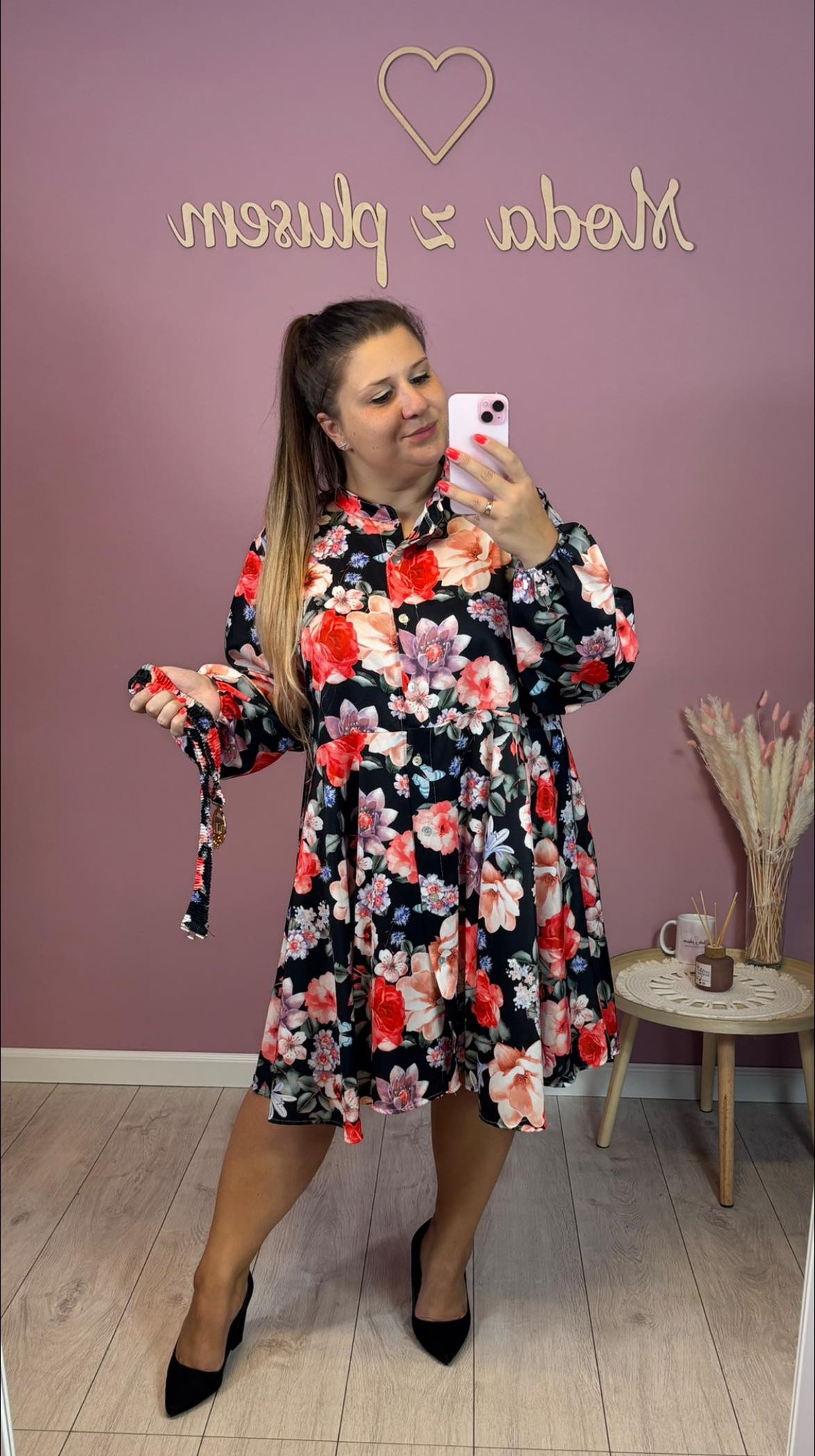Sukienka szmizjerka zapinana na guziczki, szyta z koła, na każde bioderko. W zestawie z paskiem, ale można też nosić bez.